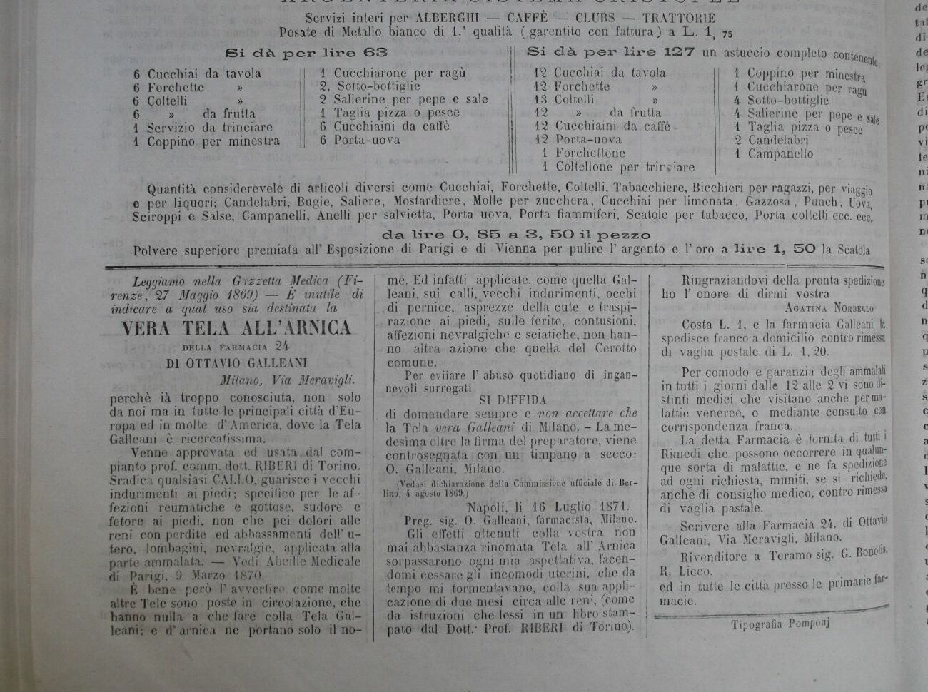 Gli effetti ottenuti colla vostra non mai abbastanza rinomata Tjèla all' Arnica sorpassarono ogni mip, aspettativa., facendomi cessare gli incomodi ,uterini, che da tempo mi tormentavano, colla sua applicazione di due mesi circa alle ren:, (come da istruzioni che Ibss-i in un labro stampato dal Dott.- Prof. RI BERI di Torino).