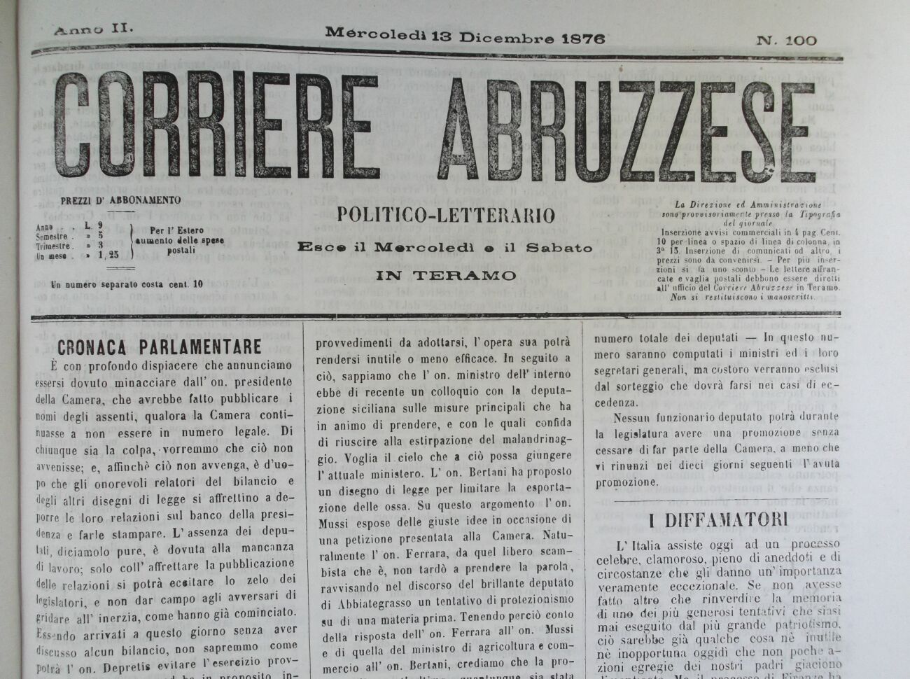 del giornale Inserzione avvisi commerciali in 4 pag. Cent. 10 per-linea o spazio di linea di colonna, in 3a 15. Inserzione di . comunicali od altro, i prezzi sono da convenirsi. - Per più inserzioni si la uno sconto - Le lettere affrancate e vaglia postali debbono essere diretti all' ufficio del Corriere Abruzzese in Teramo. iVorv si restituiscono t manoscritti.