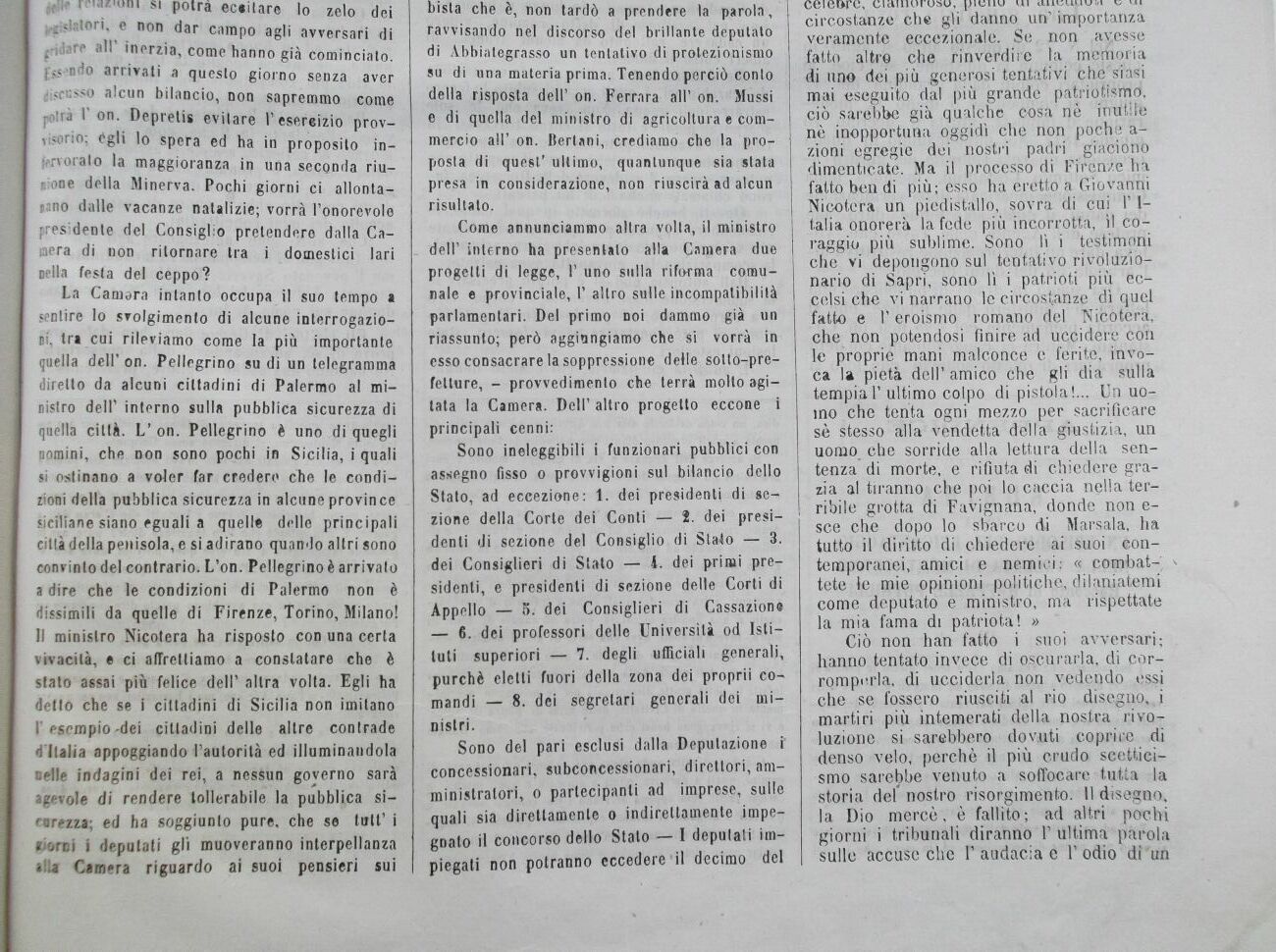 La Camara intanto occupa il suo tempo a sentire lo svolgimento di alcune interrogazioni, tra cui rileviamo come la più importante quella dell' on. Pellegrino su di un telegramma diretto da alcuni cittadini di Palermo al ministro delP interno sulla pubblica sicurezza di quella città. L' on. Pellegrino è uno di quegli nomini, che non sono pochi in Sicilia, i quali si ostinano a voler far credere che le condizioni della pubblica sicurezza in alcune province siciliane siano eguali a quelle delle principali città della penisola, e si adirano quando altri sono convinto del contrario. L'on. Pellegrino è arrivato a dire che le condizioni di Palermo non è dissimili da quelle di Firenze, Torino, Milano!