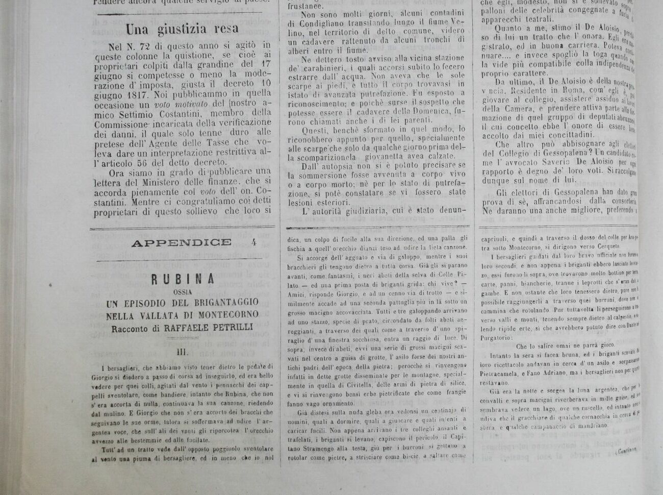 Non sono molti giorni,, alcuni contadini di Condiglìano transitando lungo il fiume Velino, nel territorio di dello comune, videro un cadavere rallentilo da alcuni tronchi di alberi entro il fiume.
