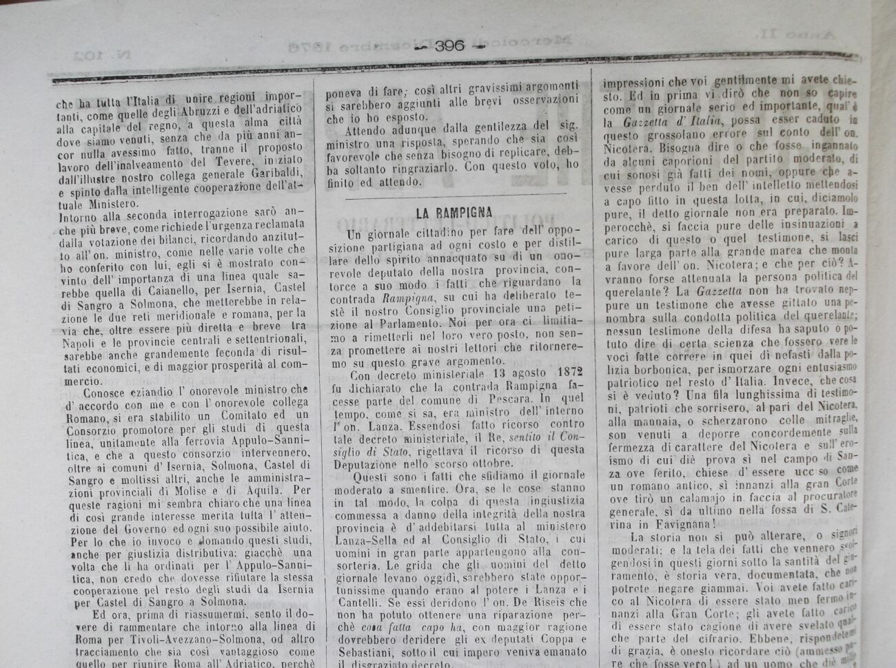 Con decreto ministeriale 13 agosto 1872 fu dichiarato che la contrada Rampigna facesse parte dpi comune di Pescara. In quel tempo, come.si sa, era ministro dell' interno J'on. Lanza. Essendosi fatto ricorso contro tale decreto ministeriale, il Re, sentito il Consiglio di Stato, rigettava il ricorso di questa Deputazióne nello scorso ottobre.