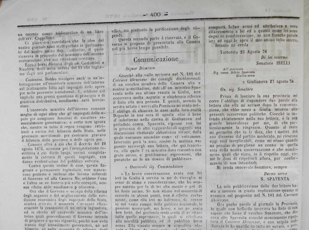 Giacché ella volle scrivere nel N. 101 del Corriere Abruzzese dei consigli disinteressati di un vecchio membro della Camera alla e nostro concittadino, dati òli'on. ministro Spaventa nella sua ultima venuta in Giulia, non occorreva molta sagacia a chichessia riferire il fatto alla mia persona. E quindi, avendo la scritta urtato i nervi alla Provincia mi sento nel-1' obbligo di chiarire le cose nella loro realtà Dopoché in una sera di agosto ebbi il bene d' imbattermi nella Casina di Giulianova col prelodato comra. Spaventa, ripassai _con lui in presenza di altri ragguardevoli soggetti una discussione elettorale abbastanza vivace, dalla quale uscimmo amendue corno vf entrammo. Interrotti però la sera, credei la mattina vegnente scrivergli una lettera, che qui trascrivo, alla quale I' ex ministro clava riscontro con grato animo, e gentilissime espressioni, che puranche mi fo un dovére di pubblicare.