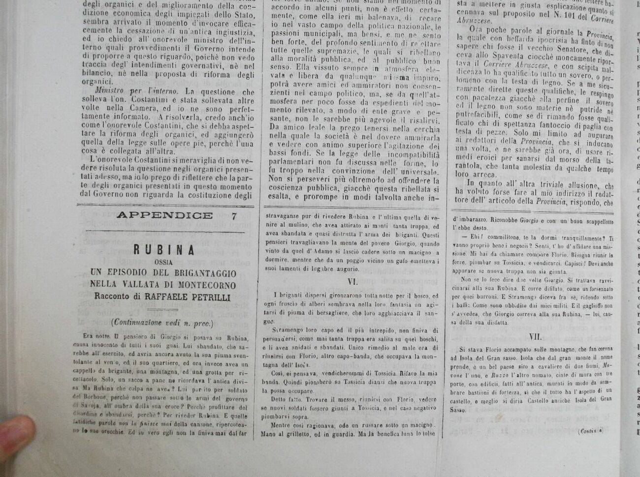 Ora poche parole al giornale la Provincia, kt q^alc con beffarda ipocrisia ha finto di non sapere chi fosse il vecchio Senatore, che diceva allo Spaventa ciocché moncamente riportava il Corriere Abruzzese, e con scipita maldicenza lo ha qualificato lutto un sovero, o perlomeno con la lesta di legno. Se a me sicura mente dirette queste qualifiche, le respingo con pacatezza giacché alla perfine il sovero ed il legno non sono materie nè putride nè pulrefacibili, come se di rimando fosse qualificato chi di spettanza fantoccio di paglia con testa di pezze. Solo mi limito ad augurare ai redattori della Provincia, che si inducano una volta, e ne sarebbe già ora, di usare rimedi eroici per sanarsi dal morso della tarantola, che tanta molestia da qualche tempo loro arreca.