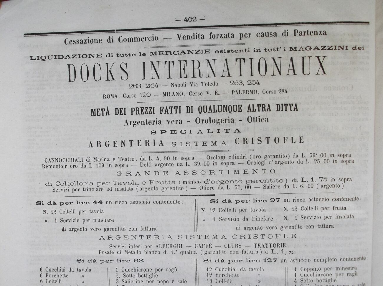 Quantità considerevele di articoli diversi come Cucchiai, Forchette, Coltelli, Tabacchiere, Bicchieri per ragazzi, per viaggio e per liquori; Candelabri, Bugie, Saliere, Mostardiere, Molle per zucchera, Cucchiai per limonata, Gazzosa, Punch, Uova, Sciroppi e Salse, Campanelli, Anelli per salvietta, Porta uova, Porta fiammiferi, Scatole per tabacco, Porta coltelli ecc. ecc.