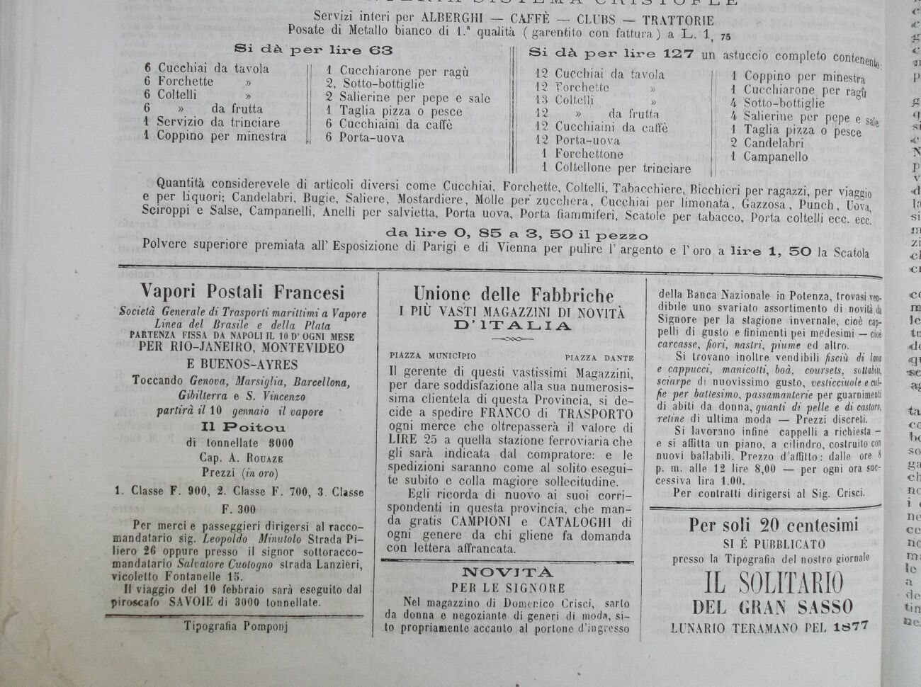 Ingerente di questi vastissimi Magazzini, per dare soddisfazione alla sua numerosissima clientela di questa Provincia, si decide a spedire FRANCO di TRASPORTO ogni merce che oltrepasserà il valore di LIRE 25 a quella stazione ferroviaria che gli sarà indicata dal compratore: e le spedizioni saranno come al solito eseguite subito e colla magiore sollecitudine.