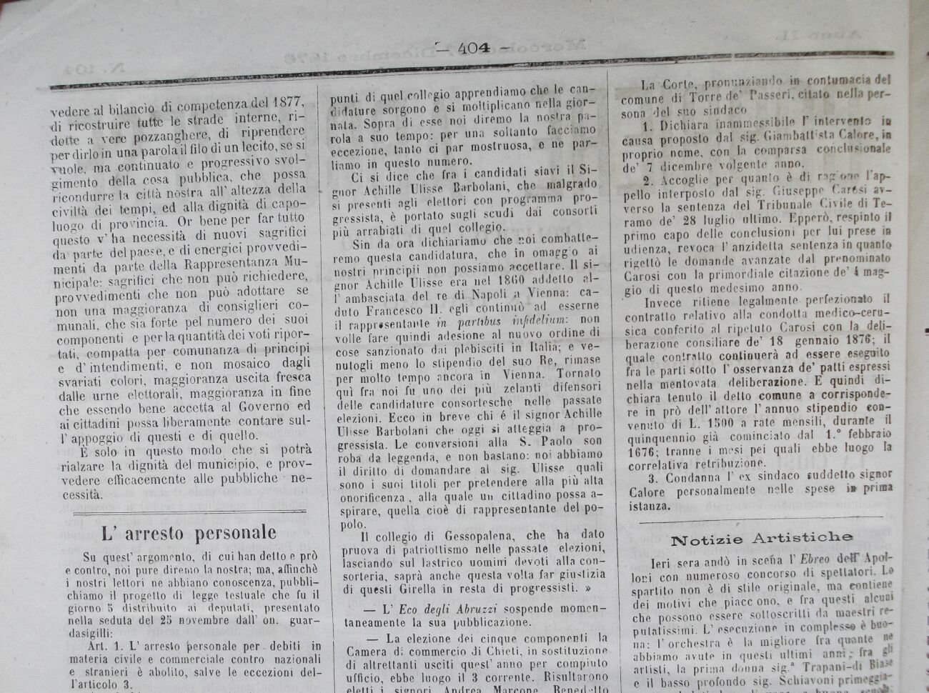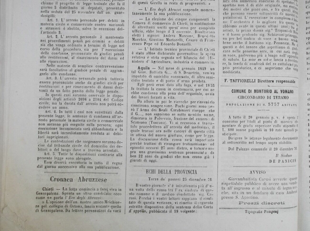 Il collegio di Gessopalena, che ha dato pruova di patriottismo nelle passate elezioni, lasciando sul lastrico uomjiri devoti alla consorteria, saprà anche questa volta far giustizia di questi Girella in resta di progressisti. »