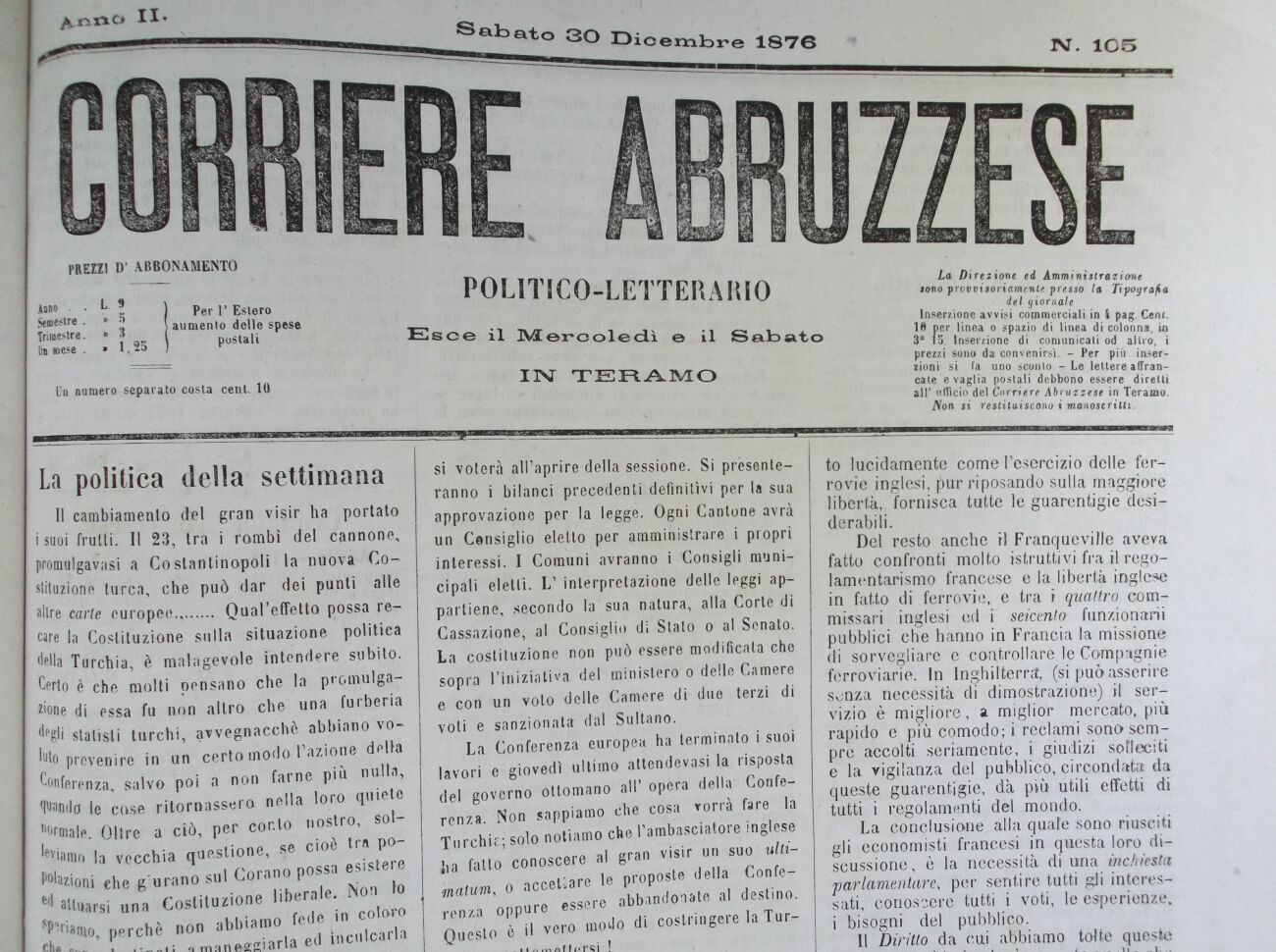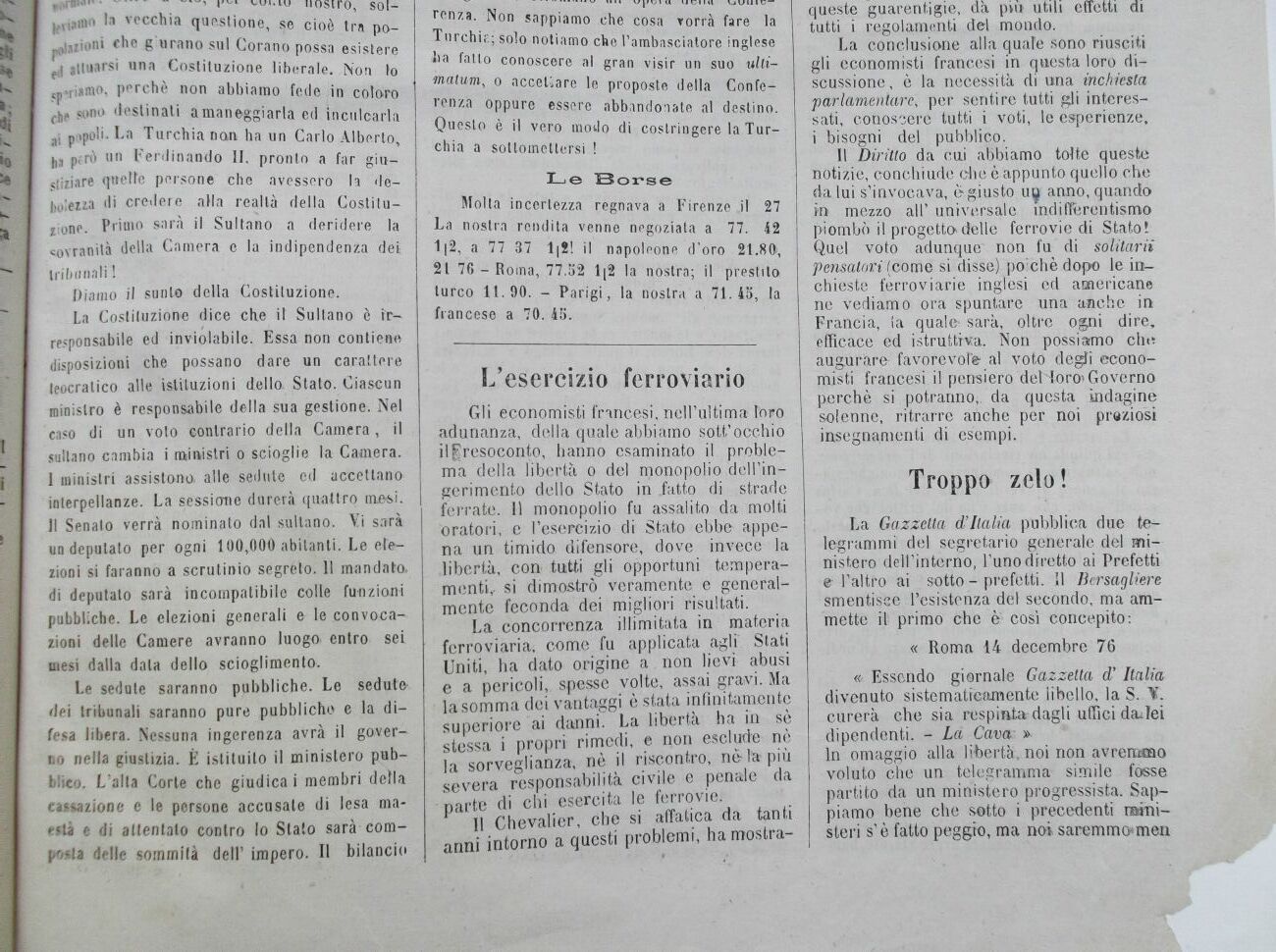 Il cambiamento del gran visir ha portato i suoi frutti. Il 23, tra i rombi del cannone, promulgavasi a Costantinopoli la nuova Costituzione turca, che può dar dei punti alle altre carte europee.»....., Qual'effetto possa recare la Costituzione sulla situazione politica della Turchia, è malagevole intendere subito. Certo è che molti pensano che la promulgatone di essa fu non altro che una furberia (kgli statisti turchi, avvegnacchè abbiano voluto prevenire in un certo modo l'azione della Conferenza, salvo poi a non farne più nulta, (fuanditi le cose ritornassero nella loro quiete normale. Oltre a ciò, per conto nostro, solleviamo la vecchia questione, se cioè tra popolazioni che giurano sul Corano possa esistere e