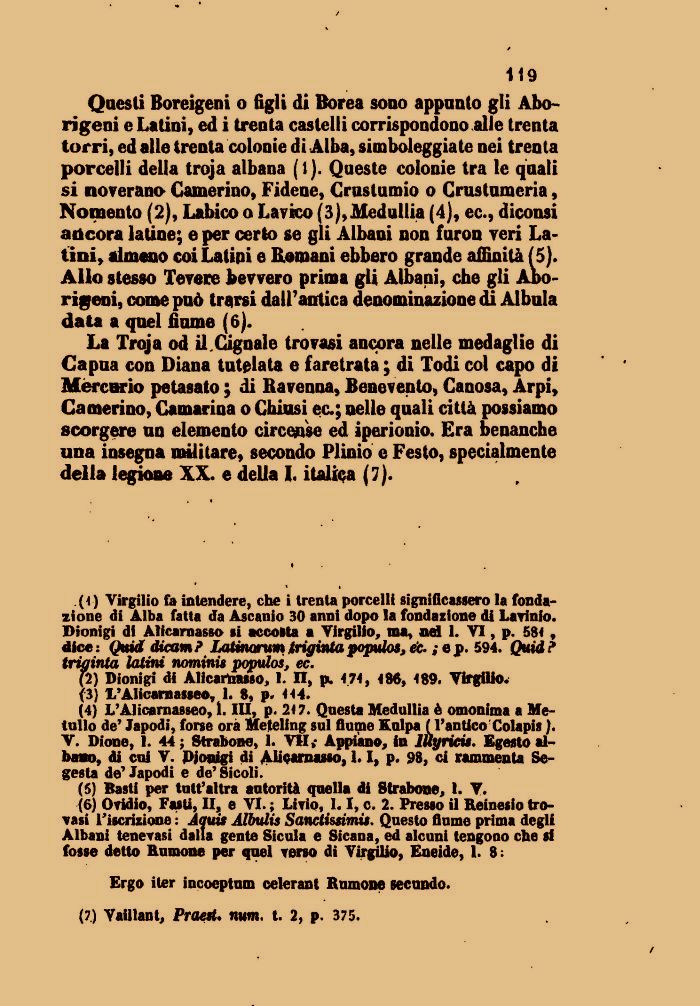 Questi Boreigeni o figli di Borea sono appunto gli Aborigeni e Latini, ed i trenta castelli corrispondono alle trenta torri, ed alle trenta colonie di Alba, simboleggiate nei trenta porcelli della troja albana (1). Queste colonie tra le quali si noverano Camerino, Fidene, Crustumio o Crustumeria, Nomento (2), Labico o Lavico (3),Medullia (4), ec., diconsi adcora latine; e per certo se gli Albani non furon veri Latini, almeno coi Latipi e Romani ebbero grande affinità (5). Allo stesso Tevere bevvero prima gli Albani, che gli Aborigeni, come può trarsi dall'antica denominazione di Albula data a quel fiume (6).