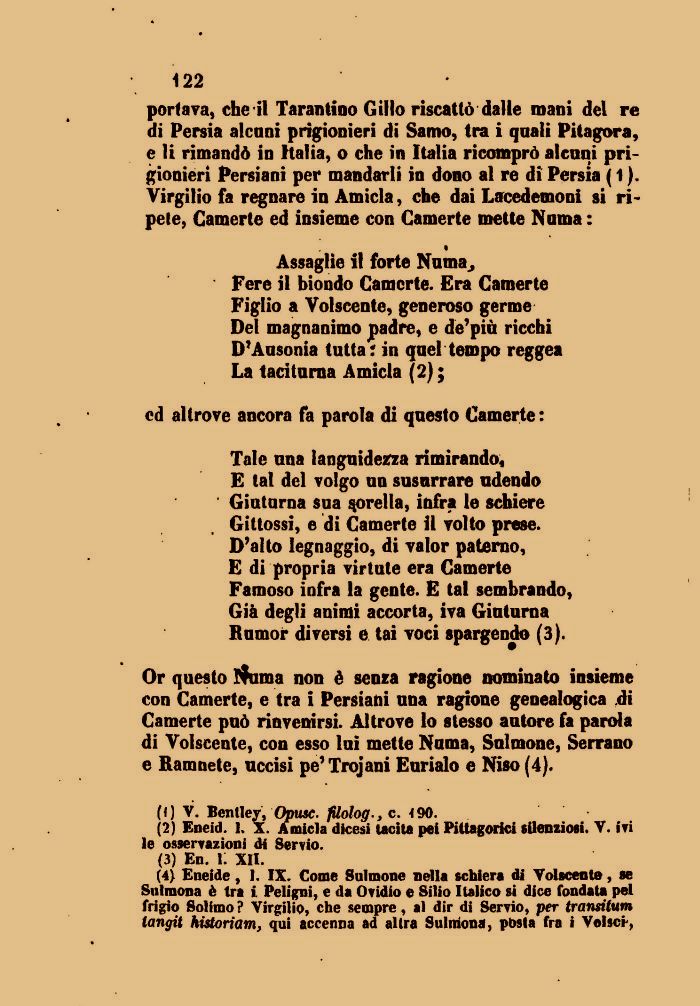 Or questo ituma non è senza ragione nominato insieme con Gamerte, e tra i Persiani una ragione genealogica ,di Gamerte può rinvenirsi. Altrove lo stesso autore fa parola di Volscente, con esso lui mette Numa, Sulmone, Serrano e Ramnete, uccisi pe' Trojani Eurialo e Niso (4).