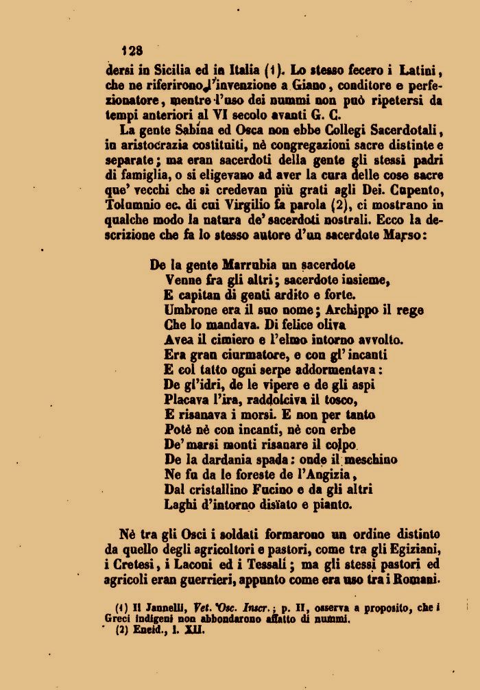 La gente Sabina ed Osca non ebbe Collegi Sacerdotali, in aristocrazia costituiti, nò congregazioni sacre distinte e separate ; ma eran sacerdoti della gente gli stessi padri di famiglia, o si eligevano ad aver la cura delle cose sacre que' vecchi che si credevan più grati agli Dei. Cupento, Tolumnio ec. di cui Virgilio fa parola (2), ci mostrano in qualche modo la natura de' sacerdoti nostrali. Ecco la descrizione che fa lo stesso autore d'un sacerdote Majrso: