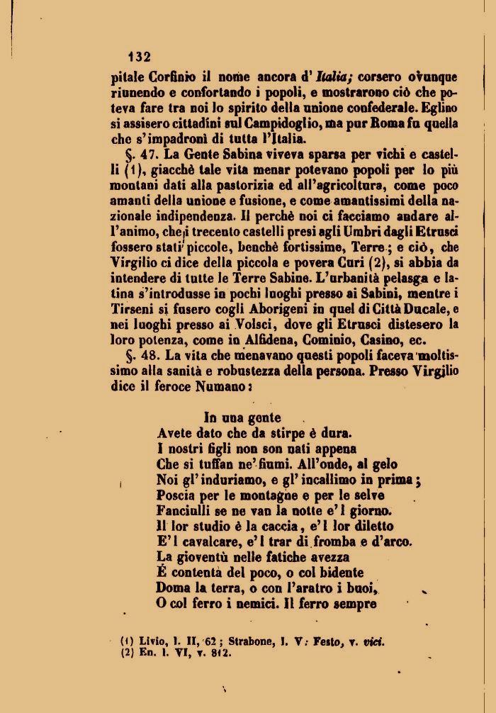 §. 47. La Gente Sabina viveva sparsa per vichi e castelli (1), giacché tale vita menar potevano popoli per lo più montani dati alla pastorizia ed all'agricoltura, come poco amanti della unione e fusione, e come amantissimi della nazionale indipendenza. Il perchè noi ci facciamo andare all'animo, che fi trecento castelli presi agli Umbri dagli Etrusci fossero stati'piccole, benché fortissime, Terre ; e ciò, che Virgilio ci dice della piccola e povera Curi (2), si abbia da intendere di tutte le Terre Sabine. L'urbanità pelasga e latina s'introdusse in pochi luoghi presso ai Sabini, mentre i Tirseni si fusero cogli Aborigeni in quel di Città Ducale, e nei luoghi presso ai Volsci, dove gli Etrusci distesero la loro potenza, come in Alfidena, Cominio, Casino, ec.