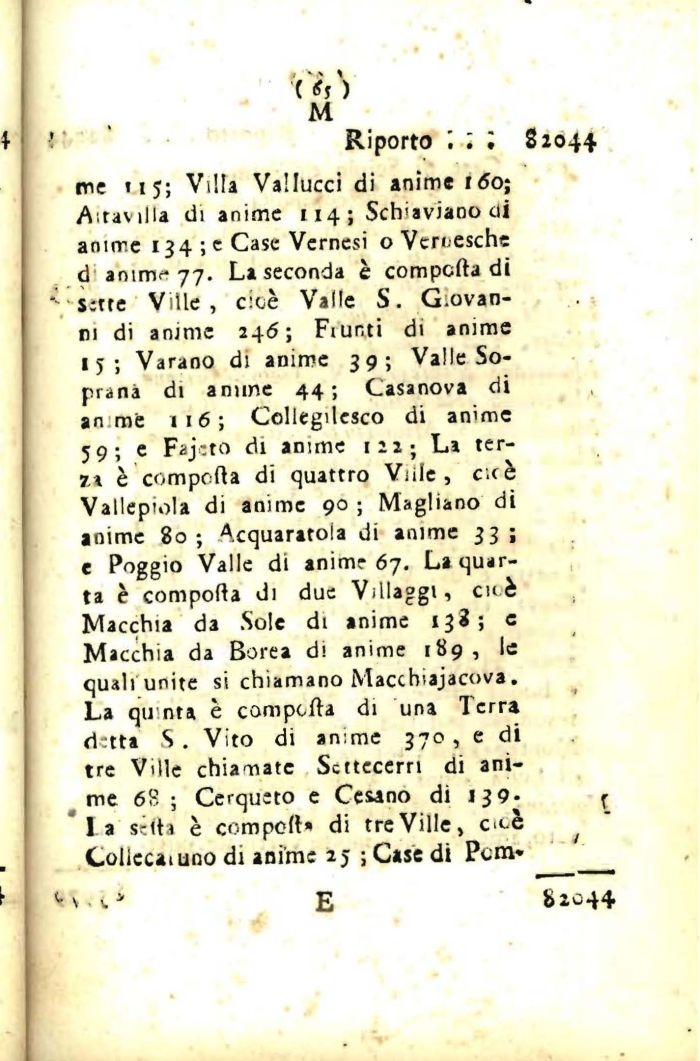 ne 115; Villa Vallucci di anime 160; Altavilla di anime 114; Sch'aviano eli anitre 134 ; e Case Vernesi o Verdesche d anim^ 77. La seconda è comporta di ^ lette Ville, cioè Valle S. G.ovan-ni di anime 246; Fiunti di anime ij; Varano di anime 39; Valle Soprani di anime 44; Casanova di anmé 116; Collegilesco di anime 59 ; e Fiij:to di anime 122; La ter-r\ è comporta di quattro Viile , c.cè Vallepiola di anime 90 ; Magliano di anime 80; Acquaratoia di anime 33; c Poggio Valle di anime 67. La quarta è comporta di due Villaggi, cu è Macchia da Sole di anime 13$; c Macchia da Borea di anime 189 , le quali unite si chiamano Macchiajacova. La quinta è comporta di una Terra detta S. Vito di anime 370, e di tre Ville chiamate Scttecerri di anime 68 ; Cerqueto e Cedano di 139. la sdta è comport» di tre Ville, ocè Coiiecatuno di anime 25 ; Case di Pcm»