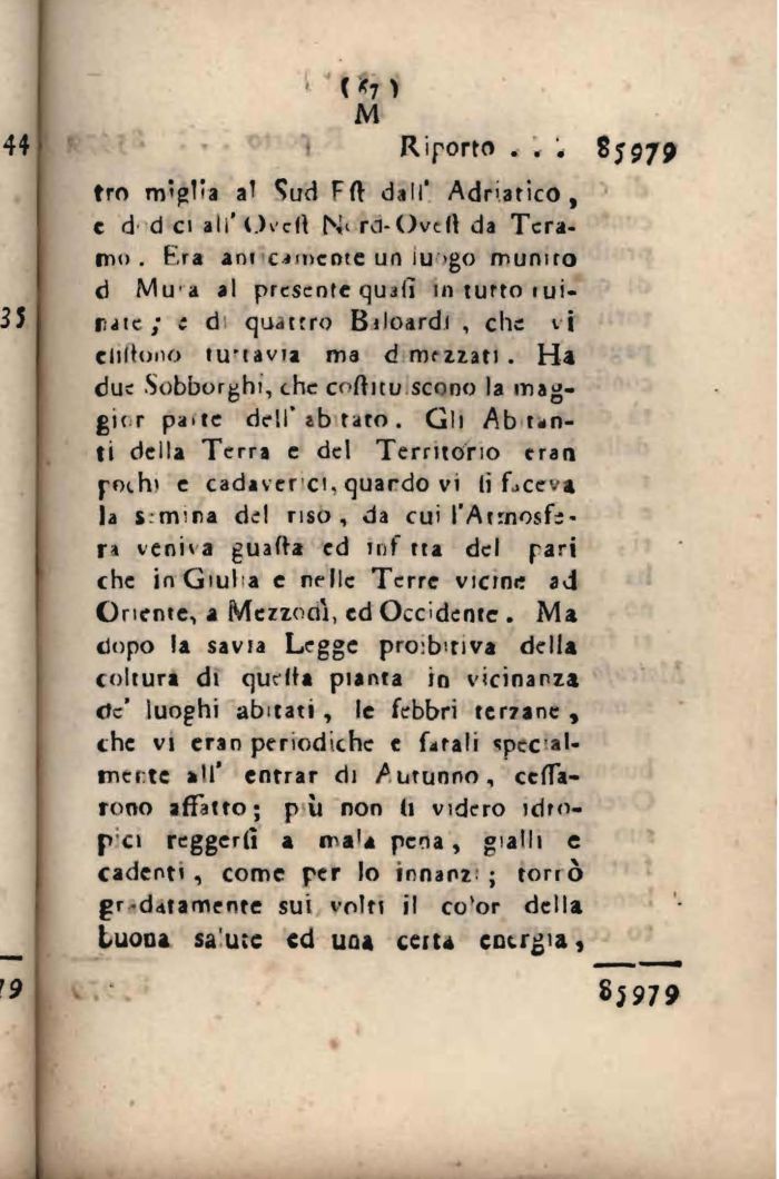 tro m'glia al ^ud Fft dall' Adriatico, c d dei all' OvcH Ni rei-Ove 11 da Teramo. F.ra ani eminente un iu >go munirò d Mu a al presente quali in turto mirate ; ; d quattro Biloardi , che I elidono «u'tavia ma d rmzzati . Ha due Sobborghi, che coftitu scono la maggie r paite dell'ib tato. Gli Ab tanti della Terra e del Territorio tran po<.h> e cadavere!, quardo vi li faceva la s mina del riso, da cui l'Atmosfera veniva guafta ed mf tta del pari che in Giulia e nrlle Terre vicine ad Oriente, a Mezzodì, ed Occidente . Ma dopo la savia Legge proibitiva della coltura di quella pianta in vicinanza de' luoghi abitati, le febbri terzane , the vi ersn periodiche e fatali *pecal-mcrte all' entrar di Autunno, celiarono affatto; pù non (1 videro ìdro-p ci reggerli a ma'* pena, gialli e cadenti, come per lo innanz: ; tonò gr-datamente sui volti il covor della tuona sa'uce ed una ceiu energia,