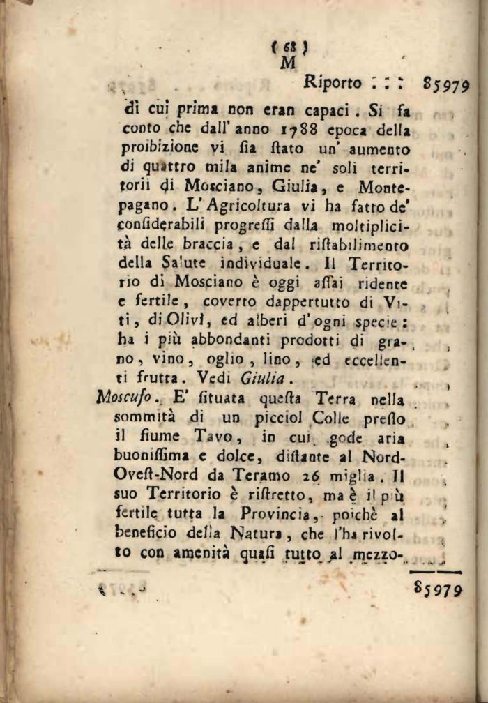 dì cui prima non cran capici . Si fa conto che dall'anno 1788 epoca della proibizione vi fia flato un' aumento di quattro mila anime ne' soli terri-torii di Motciano, Giulia, e Monte-pagano. L'Agricoltura vi ha fatto de' conliderabili progredì dalla moltiplici-tà delle braccia , e dal riflabilimeoto della $a'ute individuale. Il Territorio di Mosciano è oggi affai ridente e fertile , coverto dappertutto di Viti, di Olivi, ed alberi d'ogni spece : ha i più abbondanti prodotti di giano, vino, oglio , lino, ed eccellenti frutta . Vedi Giulia . lAoiCujo. E' fituata quetta Terra nella sommità di un piccioJ Colle preflo il fiume Tavo, in cui. .gode aria buonifljma e dolce, dittante al Nord-Ovett-Nord da Teramo 26 miglia . Il suo Territorio è riftretto, ma è il p ù fertile tutta la Provincia, poiché al beneficio della Natura , che l'ha rivolto con amenità qusfi tutto al .mezzo-.