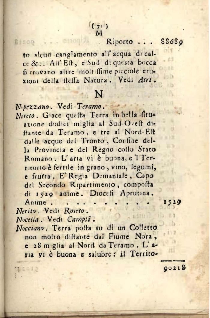 Ntì'ito. Vedi Roselo. Nocella . Vedi Campii . gocciano. Terra potta su di un Collctto non molto dittante dai Fiume Nora , c 28 m glia al Nord da Teramo . L' a-ria vi è buona c salubre : il Territo-