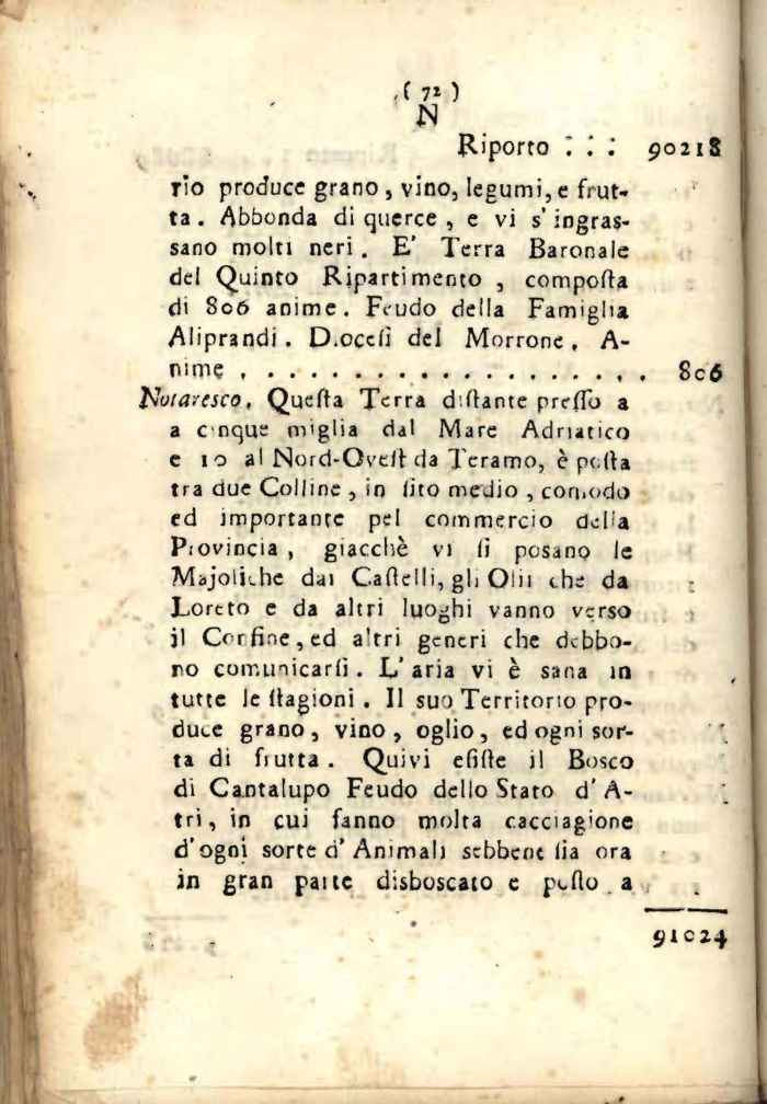 Nutavesco, Quefta Terra d'rtante pretto a a coque miglia dal Mare Adriatico e 10 al Nord-Ovett da Teramo, è porta tra due Colline , in (ito medio , comodo ed importante pel commercio dcHa P;ovincia , giacché vi li posano le Majolkhe dai Cartelli, gli Olii che da Loreto e da altri luoghi vanno verso jl Cor fine, ed altri generi che debbono comunicarli. L' aria vi è sana in tutte le llagioni . Il suo Territorio produce grano, vino, oglio, ed ogni sorta di fiutta. Quivi efirte il Bosco di Cantalupo Feudo dello Stato d' A-tri, in cui fanno molta cacciagione d'ogni sorte ri' Ammali sebbene iia ora in gran pane disboscato c pdlo. a