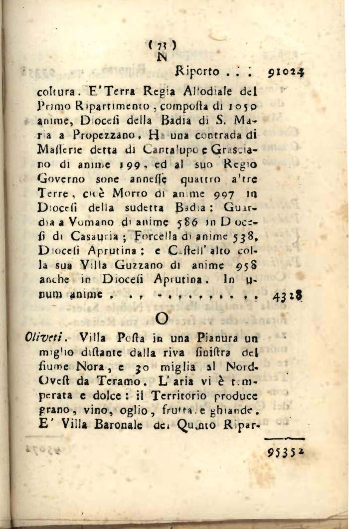 coltura. F'Terra Regia Al'odiale del Primo Ripartimento , comporta di 1050 anime, D ocefi della Badia di S. (Mara a Propezzano. H una contraria d! gallerie detta di Capta'upo c Gr.s.taro di anime 199- ed al suo Regio Governo sone anntfle quattro a'rrc Terre, C1» č Morrņ di anime 997 ni D'ocefi della sudetta B*d:a : Guir-d>a a Vomano d' anime 586 in D ocefi di Casauri» ; Forcella di anime 538, D'oceli Aprutina : e C-ftell'alto colla su» Villa Guzzano di anime 95S anche in Dioceii Apiutina. In u-Dum anime . . r 431$