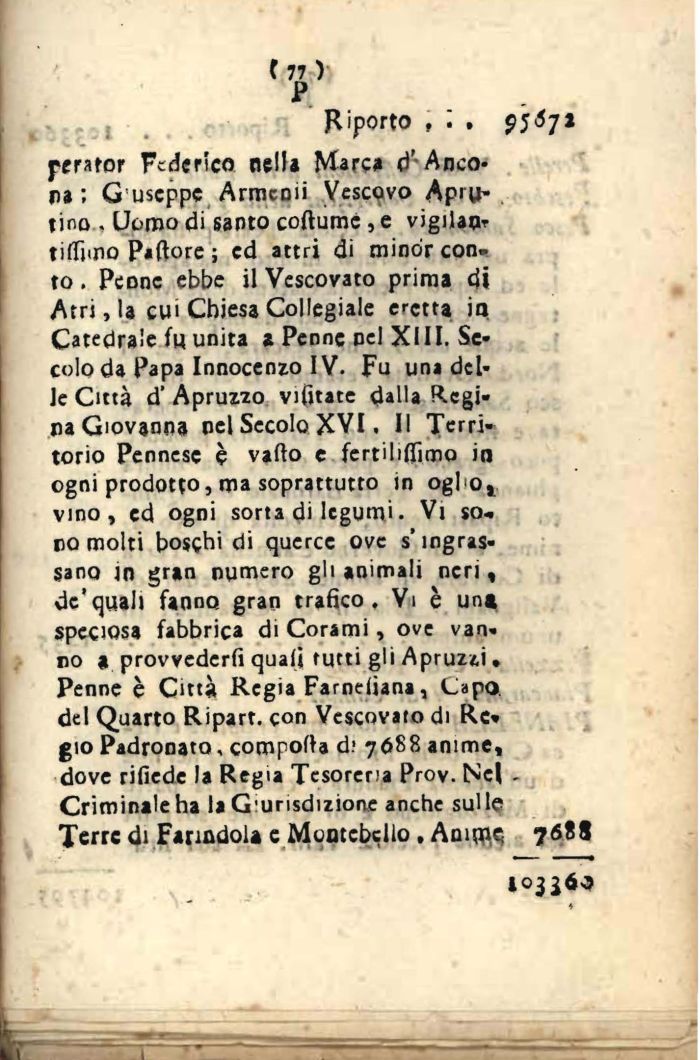 fcrmor Federico nella Marca d' Ancora; Guseppe Armcnii Vescovo Apitf-tino . Uomo di santo coftume , e vigilai titfimo Partore ; ed attri di minor conto . Penne ebbe il Vescovato prima di Atri, la cui Chiesa Collegiale eletta in Catedrale fu unita t Penne nel XIII. Secolo da Papa Innocenzo IV. Fu una delle Cittą d' Apruzzo vifitate dalla Regina Giovanna nel Secolo XVI. Il Territorio Pennese č vallo e fertiliflfimo in ogni prodotto, ma soprattutto in ogbo, vino, ed ogni sorta di legumi. Vi so* no molti boschi di querce ove s'ingrassano jn gran numero gli animali neri, de'quali fanno, gran trafico. Vi č un» speciosa fabbrica di Corami, ove vanno a provvederli quali tutti gli Apruzti » Penne č Cittą Regia Farnefiana, Capo del Quarto Ripart. con Vescovato di Re» gio Padronato, comporta d; 7688 anime, dove rifiede la Regia Tesoreria Prov. Nel -Criminale ha la Gunsdizione anche sulle Terre di Farindoia e Mcmcbcllo . Anurie 7688