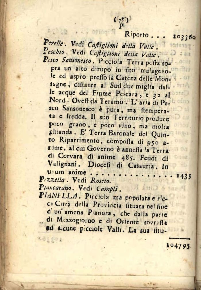 Perette. Vrdi Cafliglionì della Valle . teschio Vedi ( ujìigacni della Valle. Paco Sansonesco. Piccola Terra pc rta sopra un aito dirupo in lìto malagevole ed aspro prefto la Catena delle Montagne , dittante al Sud due miglia dalle acque del Fiume Pescara, e 32 al Nord - Oveft da Teramo . L' aria di Pesco Sansonesco è pura, ma (temperata c tredda. Il suo Territorio produce poco grano , e poco vino , ma molta ghianda . E' Terra Baronale del Quinto Ripartimelo, comporta di 950 a-r ime, al cui Governo è annefta 'a Terra di Corvara di anime 485. Feudi di Valignani. Diocefi di Casauria. in