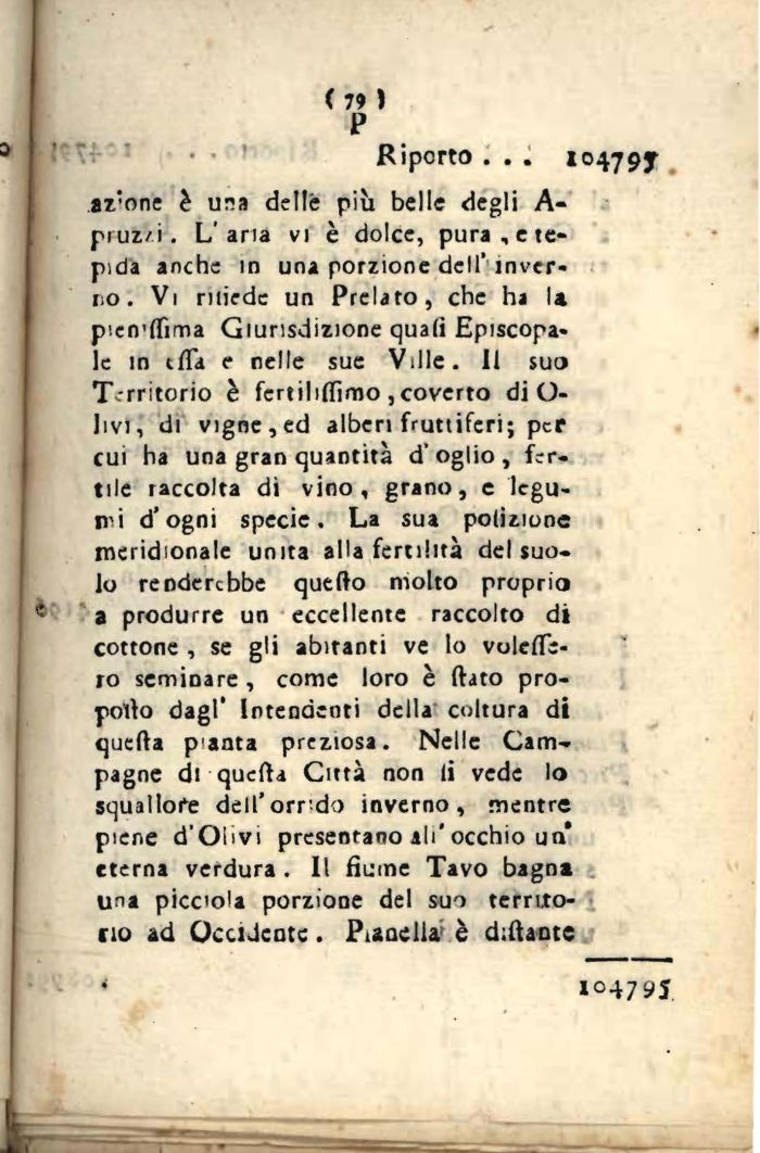 az'one è ura delle più belle degli A-pruz/i. L'aria vi è dolce, pura, e tepida anche in una porzione dell'inverno . Vi riliede un Prelato, che ha la p'.en'flìma Giurisdizione quali Episcopale in ttta e nelle sue Ville. 11 suo Territorio è fertiliflìmo , coverto di telivi, di vigne,ed alberi fruttiferi; per cui ha una gran quantità d'oglio, fertile raccolta dì vino, grano, e legumi d'ogni specie. La sua polizione meridionale unita alla fertilità del suo-Io renderebbe qutfto molto proprio a produrre un eccellente raccolto di cottone , se gli abitanti ve lo volette-ro seminare , come loro è ftato pro-pollo dagl' Intendenti della coltura di quefta pianta preziosa. Nelle Campagne di quefta Città non li vede lo squallore dell'orrido inverno, mentre piene d'Olivi presentano ali* occhio un* eterna verdura . Il fiume Tavo bagna una piccola porzione del suo territorio ad Occidente. Pianella è dittante