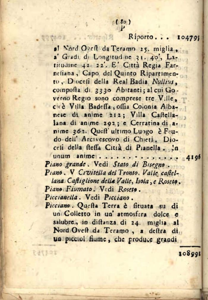 Vicciano. Quefta Terra è fituata su di un Colletto in un atmosfera dolce e salubre,, in dirtanza di 24. miglia al Nord Oveft da Teramo , a deftra di, uo piccini fiume, che produce grandi