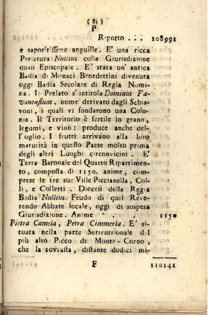 e saport'fli re ansuilte. E' una r;cca Prelatura Nuttius colla Giurisdizione cuiu Episcopale . E' stata un' ant'ca Badia di Monaci Benedettini divenuta oggi Badia Secolare di Regia Nomi-ra . Il Prelato s' intitola Dominus Fd-VJnenfium , nome derivato dagli Schia-voni, i quali vi fondarono una Colonia . Il Territorio è fertile in grano, legumi, e vino: produce anche dell' oglio. I frutti arrivano alla loro matuiità in quetto Paese molto prima degli altri Luoghi crconvicini . fc,* Terra Baronale dri Quarto Ripartimen-to, comporta di 1150. anime, comprese le tre sue Ville Piccianella , Colli , e Colletti . Dicceli dtila Reg a Bidia Ntillius. Feudo di quel Reverendo Abbate locale, oggi di sospesa Giurisdizione. An'me * .