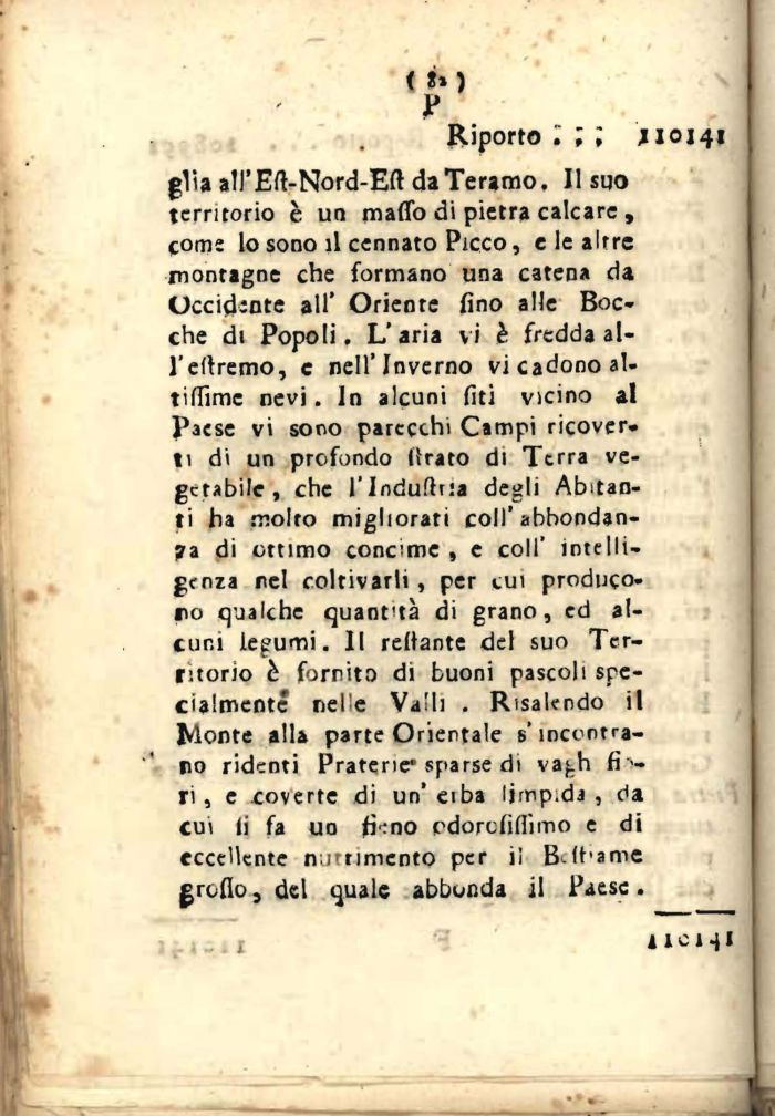 glia sIl'Eft-Nord-Eft da Teramo. Il suo territorio č uo maffo di pietra calcare , come lo sono il cennato Picco, e le altre montagne che formano una catena da Occidente all' Oriente fino alle Bocche di Popoli. L'aria vi č fredda al-l'eflremo, e nell'Inverno vi cadono al-tiffime nevi. In alcuni fui vicino al Paese vi sono parecchi Campi ricover-ti di un profondo (Irato di Terra vegetabile, che l'Indufhėa degli Abitanti ha molto migliorati colf abbondanza di ottimo concime , e colf intelligenza rei coltivarli, per cui producono qualche quantitā di grano, ed alcuni legumi. Il rellante del suo Territorio č fornito di buoni pascoli specialmente nelle Valli . Risalendo il Monte alla parte Orientale s'incentrato ridenti Praterie* sparse di vaj.h fi--ri, e coverte di un' ciba Ijmp.da , da cui fi fa uo fr:no rdorefiflėmo e di eccellente nutrimento per il B lt'ame groflo, del quale abbonda il Paese.