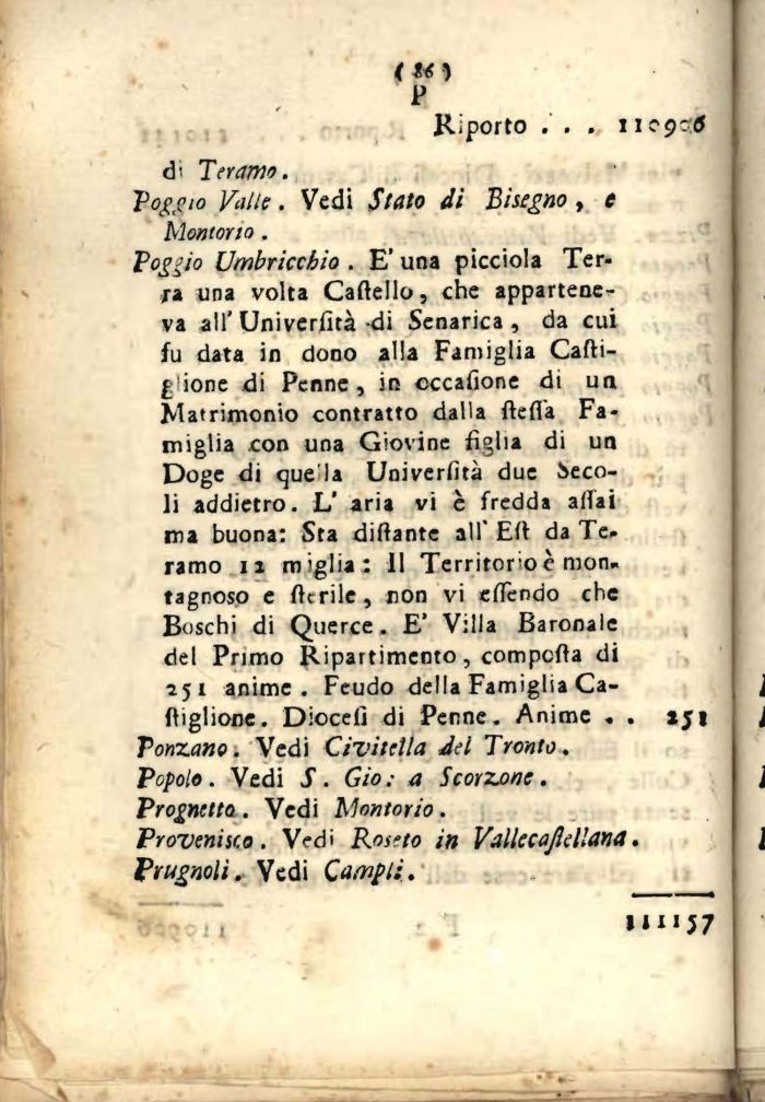 Poggio Umbricchio . E' una picciola Terra una volta Cartello, che apparteneva all' Univerfità di Senarica , da cui fu data in dono alla Famiglia Cattinone di Penne, in cccafione di un Matrimonio contratto dalla fletta Famiglia con una Giovine figlia di un Doge di que'la Univerfità due Secoli addietro. L' aria vi è fredda affai ma buona: Sta dittante all' Ert da Teramo ii miglia: 11 Territorioc montagnoso e ttcrile, non vi ertèndo che Buschi di Querce. E' Villa Baronale del Primo Ripartimento, compatta di 251 anime. Feudo della Famiglia Cattigliene. Diocefi di Penne. Anime . . iji