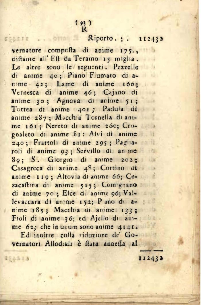vernatore comprila di anime 175., dittante all'Ftt da Teramo 15 miglia. Le altre sono le seguenti. PezzeiSe di anime 40 ; Piano F umato di a-rme 4 2; Lame di anime 160; Vctncsca di anime 46; Cajtno dì anime 30; Agncva di arime 51; Tottea di anime 401 ; Padula di anime 287 ; M