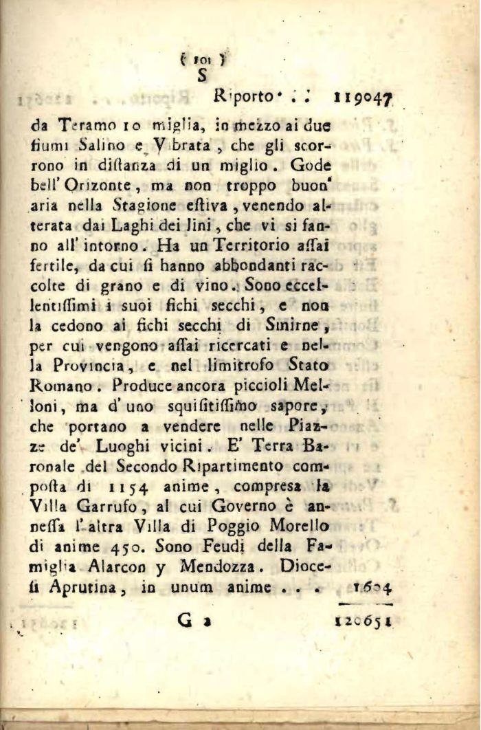 da Teramo 10 miglia, in mezzo ai due fiumi Salino e V brata , the gli scorrono in didanza di un miglio . Gode beli' Orizonte, ma non troppo buon* aria nella Stagione eftiva , venendo alterata dai Laghi dei Jini, che vi si fanno all'intorno. Ha un Territorio affai fertile, da cui fi hanno abbondanti raccolte di grano e di vino. Sono eccel-lentiflimi i suoi fichi secchi, e noa la cedono ai fichi secchi di Smirne , per cui vengono affai ricercati e nella Provincia, e nel limitrofo Stato Romano . Produce ancora piccioli Melloni, ma d'uno squifitiffiAio sapore,' che portano a vendere nelle Piazza de' Luoghi vicini. E' Terra Baronale del Secondo Ripartimento comporta di 1154 anime, compresa 1» Villa Garrufo, al cui Governo è annetta l'altra Villa di Poggio Morello di anime 450. Sono Feudi della Famigli Alarcon y Mendozza. Dioce-U Aprutina j in unum anime . . . t5>4