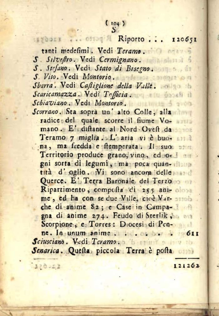 Scorrano. Sta sopra un' alto Colle, alla radice del quale scorre il fiume Vo-mano . E' dittante al Nord Oveft da Teramo 7 miglia . • L' aria vi è buona , ma fredda e {temperata . Il suo Territorio produce grano, vino, ed o-gni sorta di legumi, ma poca quantità d' oglio . -Vi sono ancona delle Querce. E' Terra Baronale del Terzo Ripartimento, compatta di 255 anime , ed ha con se due Ville, cioè Var-che di anime S2 ; e Case in Campagna di anime 274. Feudo diSterlik, Scorpione , e Torres : Diocesi di Penne. In unum anime......6n