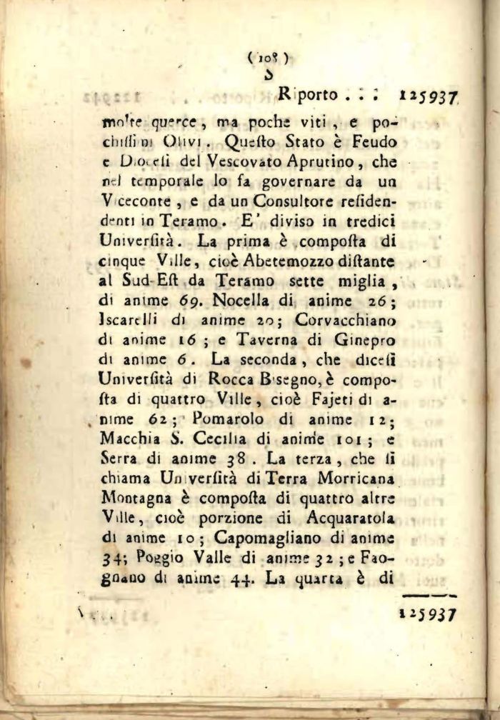 tnnV qwrce , ma poche viti , e pochini ni Olivi. Quelito Stato è Feudo e D.Oidi del Vescovato Aprutino , che nrl temporale Io fa governare da un V ceconte , e da un Consultore rendendoti in Teramo . E' diviso in tredici Univerfità. La prima è comporta di cinque V.Ile, cioè Abetemozzo dittante al Sud Eft da Teramo sette miglia , di anime 69. Nocella di anime 26 ; Iscartlli di anime 20; Corvacchiano di anime 16 ; e Taverna di Ginepro di anime 6. La seconda, che dicell Univerlìtà di Rocca B segno, è comporta di quattro Ville, cioè Fajeti di a-nime 62; Pomarolo di anime 12; Macchia S. Cecilia di anime 101 ; e Serra di anime 38 . La terza, che lì chiama Unverfìtà di Terra Morricana Montagna è comporta di quattro altre Ville, cioè porzione di Acquaratola di anime 10; Capomagliano di anime 34-, Poggio Valle di anime 3 2 ; e Fao-gn«uo di amine 44. La quarta è di
