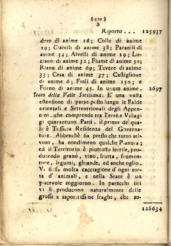 d?ro d'i anime 16; Colle di anime 29; Ciardi) di anime 38; Paranili di anime 34; Alvelli di anime 19; Luciano di anime 32 ; Fiume di anime 50; Riano di anime 69; Tevere di anime 33 ; Cesa di anime 37 ; Caftiglioue di anime 6; Fioli di anime 150; e Forno di anime 45. In u-.um anime. 2697 Uato della Valle Siciliana. E' una valla cfteniione di patse pcfto lungo le Falde orientali e Settentrionali degli Appen-r.'ni, che comprende tra Terre e Villaggi quarantuno Paeii . il primo de quali è Tiflkia Relidenza del Governatole, Abbcnchè lia predo che rutto sei* voso , ha nondimeno qualche P.anu^a ; ed il Territorio è piuttolto tsrtile, pro-ducendo granò, vino, frutta, frumentone, legumi, ghiande, ed anche ogho. Vi fi fa molta cacciagione d'ogni sorta d' animali , e nella State è un piacevole soggiorno. In parecchi liti \i fi producono naturalmente delle groffe c sapor.tiffi ne fraghe , chc so-
