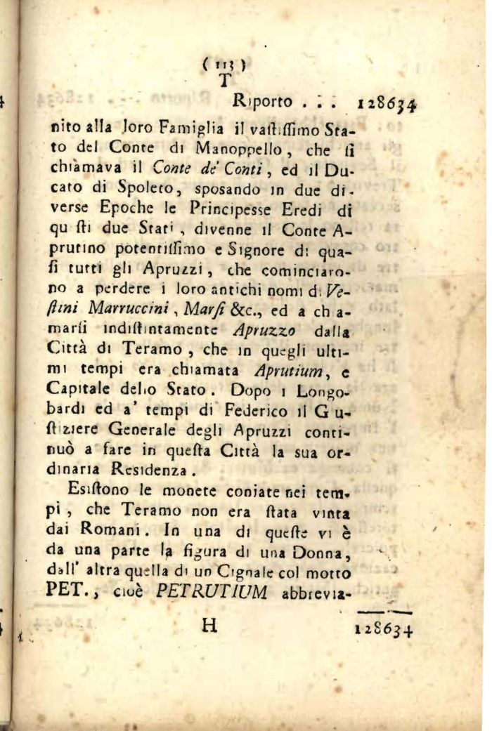 Esiftono le monete coniate nei tem. pi , che Teramo non era fiata vinta dai Romani. In una di quefte vi è da una parte la figura di una Donna, dall' altra qutlla di un Cignale col motto PET., cioè PETRUT1UM abbaiali 12S634