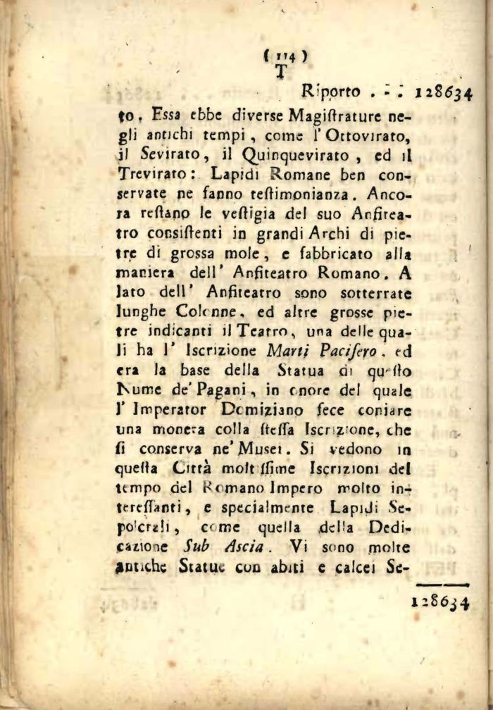 fo. Essa ebbe diverse Magiftrature negli antichi tempi, come 1'Ottovirato, j, Sevirato, il Quinquevirato , ed il Trcvirato : Lapidi Romane ben conservate ne fanno teftimonianza. Ancora rcOano le veftigia de! suo Anfiteatro consiftenti in grandi Archi di pietre di grossa mole, e fabbricato alla maniera dell' Anfiteatro Romano. A lato dell' Anfiteatro sono sotterrate lunghe Cotenne, ed altre grosse pietre indicanti il Teatro, una delle quali ha I' Iscrizione Marti Pacifero, ed era la base della Statua di qu'ffo Nume de'Pagani, in more del quale 1' lmper2tor Domiziano fece coniare una monera colla ftefla Iscrizione, che fi conserva ne' Musei. Si vedono in quelta Citrà moft Ifìme Iscrizioni del ttmpo del K< mano Impero molto in-tereflanti, e specialmente LapiJi Se-po'cr*!i, o me quella ,delia Dedicano^ Sul' Ascia. Vi seno molte £utithc Statue cuu abiti e calcei Se-
