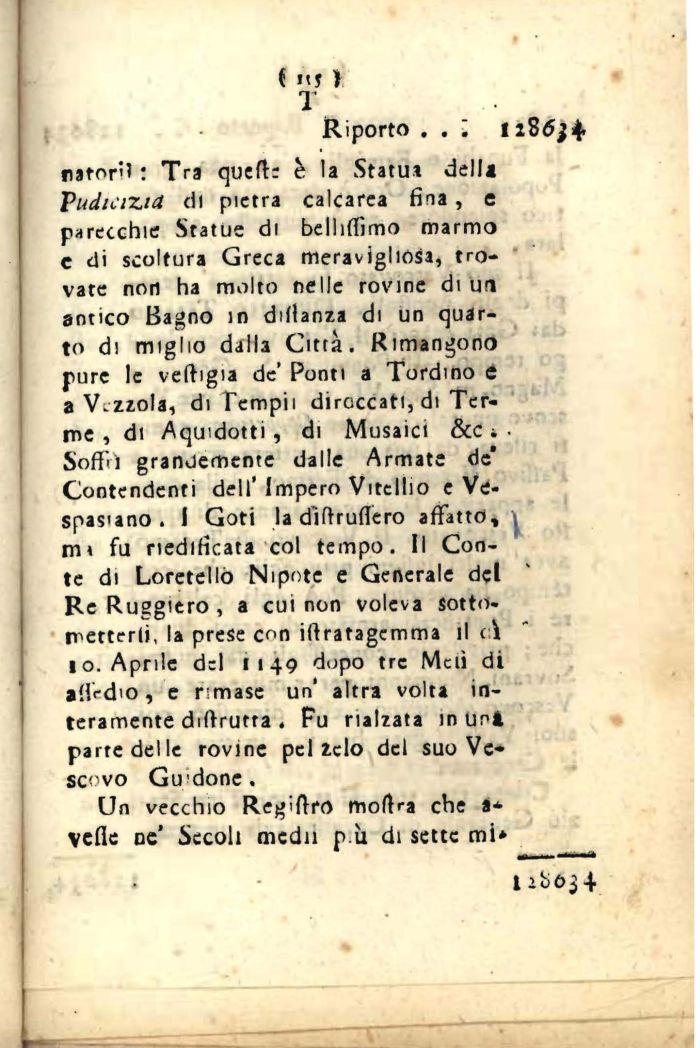 rstor : Tra queft: è la Statuì del!* Pudicizia di pietra calcarea fina , e parecchie Statue di belhflìmo marmo c di scoltura Greca meravigliosa, trovate non ha molto nelle rovine di un antico Bagno in diilanza di un quarto di miglio dalla Città. Rimangono pure le veftigia de' Ponti a Tordino e a V.zzola, di Tempii diroccati, di Terme, di Aqu.dotti, di Musaici &c i . Soffi 1 granoemente dalle Armate de Contendenti dell' Impero Vitcllio e Vespasiano . 1 Goti la dìftruflero affatto, , mi fu riedificata col tempo. Il Conte di Loretellò Nipote e Generale del ' Re Ruggiero , a cui non voleva sottometterli, la prese con ilfratagemma il c i 10. Aprile del 1149 dopo tre Mcù di a(fcdio, e rimase un' altra volta interamente diftrutta . Fu rialzata in uni parte del le rovine pel Zelo del suo Vescovo Gudone.