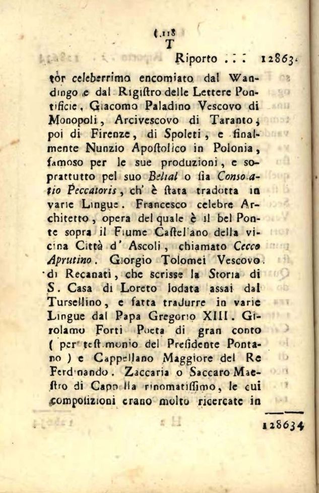 tòr celeberrimo encomiato dal Wan-dmgo ,e dal Rigiftro delle Lettere Pontificie , Giacomo Paladino Vescovo di Monopoli, Arcivescovo di Taranto * poi di Firenze, di Spoleti , e finalmente Nunzio Apoftolico in Polonia, famoso per le sue produzioni, e soprattutto pel suo Btlial o lìa Como a-tio Peccatori* , eh' c ftata tradotta ia varie Lingue. Francesco celebre Architetto , opera del quale è il bel Ponte sopra il Fiume Cartel ano della vi-cna Città d' Ascoli, chiamato Cecco Aprutmo. Giorgio Tolomei Vescovo. •di Recanati, che scrisse la Storia di S. Casa di Loreto iodata assai dal Tursellino, e fatta tradurre in vane Lingue dal Papa Gregorio XIII. Girolamo Forti Poeta di gran conto ( per teft mon'o del Prefidente Ponta-ro ) e Cappellano Maggiore del Re Fcrd nando. Zaccaria o Saccaro Mae-ftro di Capri Ila rnomatiflìmo, le cui xeni polmoni erano molto ricercate in