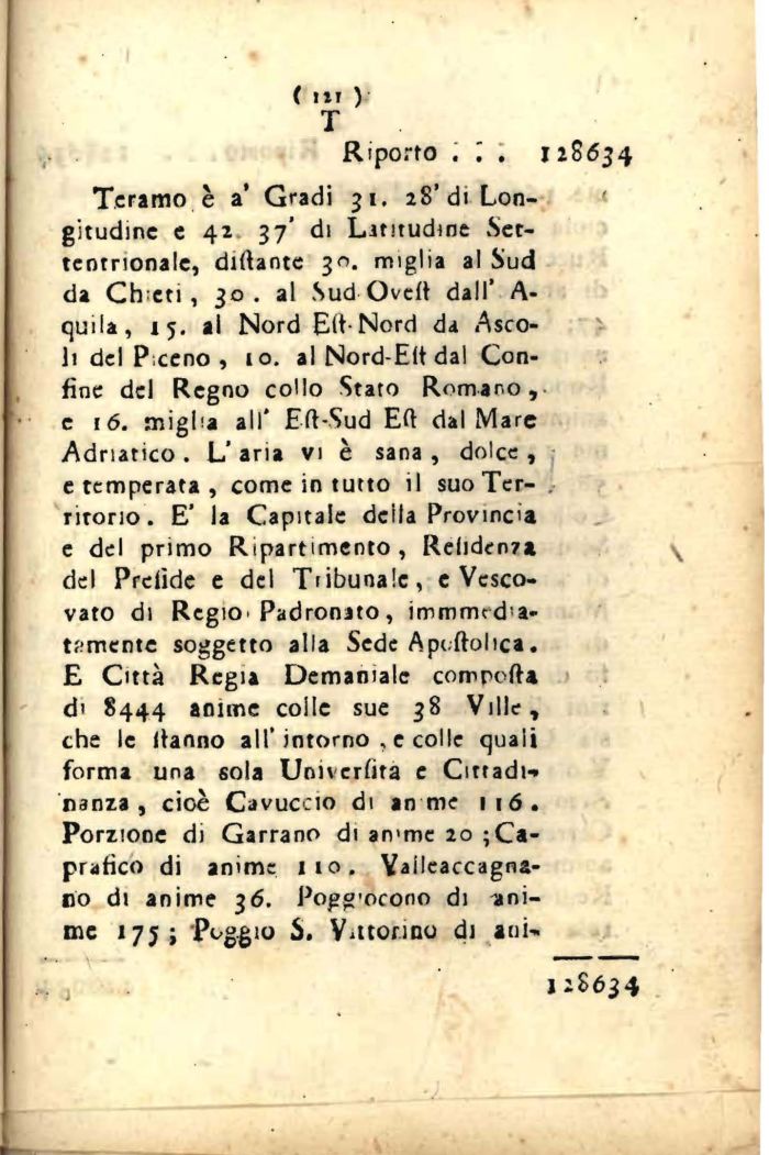 Teramo è a' Gradi 31, 28'di Lon- < gitudinc e 42 37' di Latitudine Set-tenrrionale, dittante 30. miglia al Sud da Ch eti, 30. al Sud Oveft dall' A-quila, 15. ai Nord Ett-Nord da «Ascoli del Piceno , 10. al Nord-Eit dal Confine del Regno collo Stato Romano,, e 16. miglia all' Ett-Sud Ett dal Marc Adriatico . L' aria vi è sana , dolce , e temperata , come in tutto il suo Territorio. E' la Capitale della Provincia e del primo Ripartimento, Relidenza del Prciide e del Tribunale, e Vescovato di Regio. Padronato , immrmda-t?;mente soggetto alla Sede Apoftolica. E Città Regia Demaniale comporta di 8444 anime colle sue 38 Ville, che le ftanno all'intorno , e colle quali forma una sola Univerlita e Cittadi-» nanza , cioè Cavuccio di an me 116. Porzione di Garrano di an>me 20 ;Ca-prafico di anime 110. Yalleaccagna-ro di anime 36. Pogg'ocono di anime 175; Poggio S. Vittorino di ani-