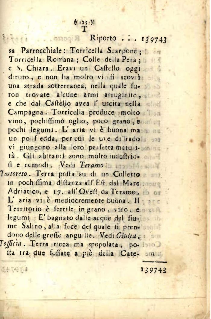 sa Parrocchiale : Torrcella Scarpone; Torricella Roirana ; Colle della Pera ; e V Chiara. Eravi un Cartello oggi d ruto , e non ha molto vi fi scoviì una strada sotterranea, nella quale fu-ron tiovate alcune armi arruginite, e che dal Cartello avea I' uscita ncJla Campagna . Torricelia produce molto vino, poch filmo oglio, poco grano, e pochi legumi. L* aria vi è buona ma un po f ecida, per cui le uv e di rado vi giungono alla loro peifettamatu l-tà . Gli ab'tanti sono molto ìuduftiio-lì e ccmodi. Vedi Teramo.