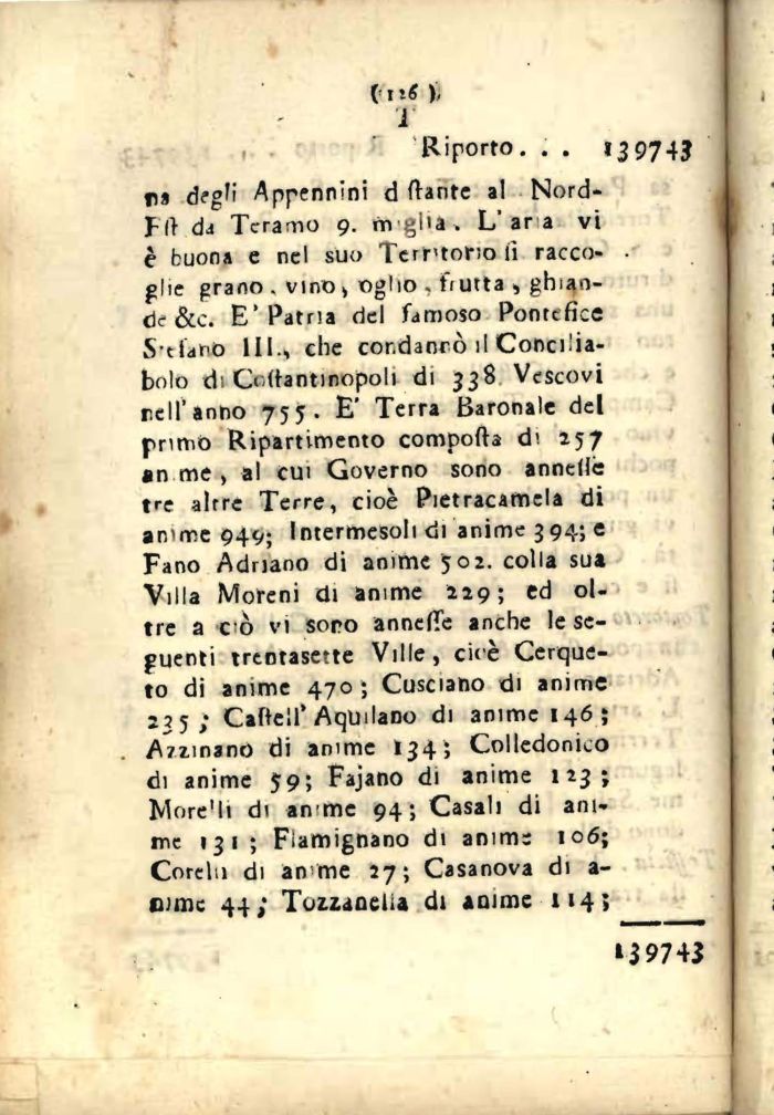 r« degli Appennini d (tante al Nord-Fi} da Teramo 9. m glia . L'ar a vi è buona e nel suo Territorio li racco- ¦ glie grano . vino > oglio , fiutta , ghiande &c. E'Patria del famoso Pontefice S tiano III., che condannò il Conciliabolo di Cottantinopoli di 338 Vescovi nell'anno 755. E' Terra Baronale del primo Ripartimento comporta di 257 «n me , al cui Governo sono annellé fé alrre Terre, cioè Pietracamela di anime 949; Intermesoli di anime 3 94; e Fano Adriano di anime 502. colla sua Villa Moreni di anime 229; ed oltre a ciò vi soro annette anche le seguenti trentasette Ville, cioè Cerque-to di anime 470; Cusciano di anime 235; Cafteir Aquilano di animerò; Ammano di anime I34; Colledonico di anime 59; Fajano di anime 123; More'li di an-me 94; Casali di anime 131 ; Fiamignano di anime 106; Corchi di an me 27; Casanova di a-cimc 44; Tozzaneiia di anime 114;
