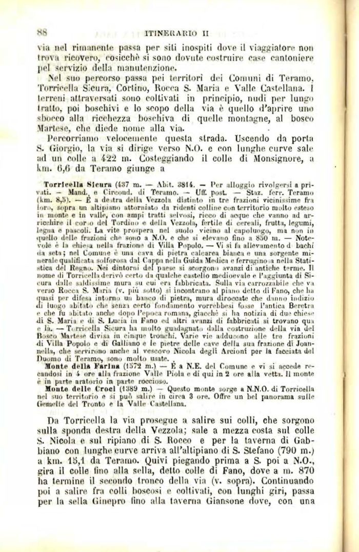 Da Torricella la via prosegue a salire sui colli, che sorgono sulla sponda destra della Vezzola; sale a mezza costa sul colle S. Nicola e sul ripiano di S. Rocco e per la taverna di Gabbiano con lunghe curve arriva all'altipiano di S. Stefano (790 m.) a km. 13,1 da Teramo. Quivi piegando prima a S. poi a N.O., gira il colle lino alla sella, detto colle di Fano, dove a ni. 870 ha termine il secondo tronco della via (v. sopra). Continuando poi a salire fra colli boscosi e coltivati, Con lunghi giri, passa per la sella Ginepro lino alla taverna Giansone dove, con una