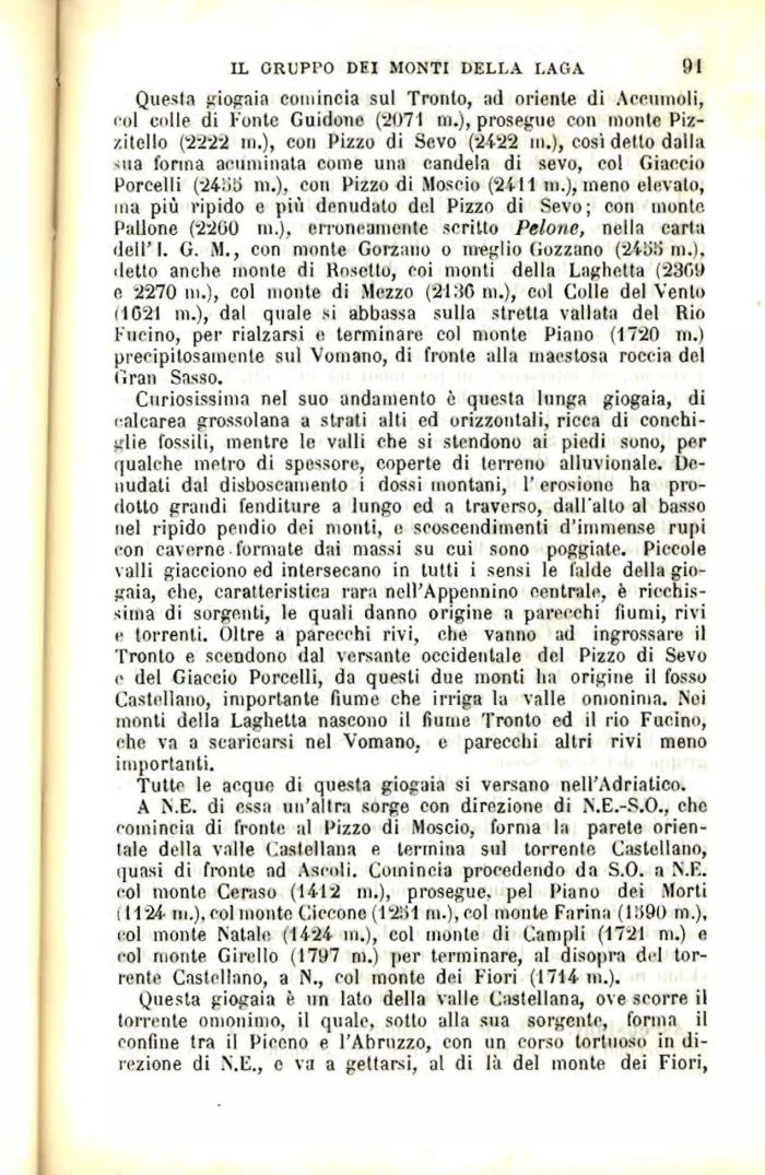Questa giogaia comincia sul Tronto, ad oriente di Arcuinoli, col culle di l'onte Guidone (2071 ni.), prosegue con molile Piz-zitcllo (2-222 in.), con Pizzo di Sevo (2422 in.), cosi dello dalla ni.), con Pizzo di Moscio (24-11 in.), meno elevalo, ina più ripido e più denudato del Pizzo di Sevo; con monte Pallone (2-200 in.), erroneamente scritto Pelone, nella caria dell'I. G. M., con monte Gorzano o meglio Gozzano (2455 ni.), detto anche monte di Rosolio, coi monti della Laghetta (23f>9 e -2270 m.), col monte di Mezzo (21 HO ni.), col Colle del Yenlo ilC'21 ni.), dal quale si abbassa sulla stretta vallata del Rio Facino, per rialzarsi e terminare col monte Piano (1720 ni.) precipitosamente sul Vomano, di fronte alla maestosa roccia del Gran Sasso.