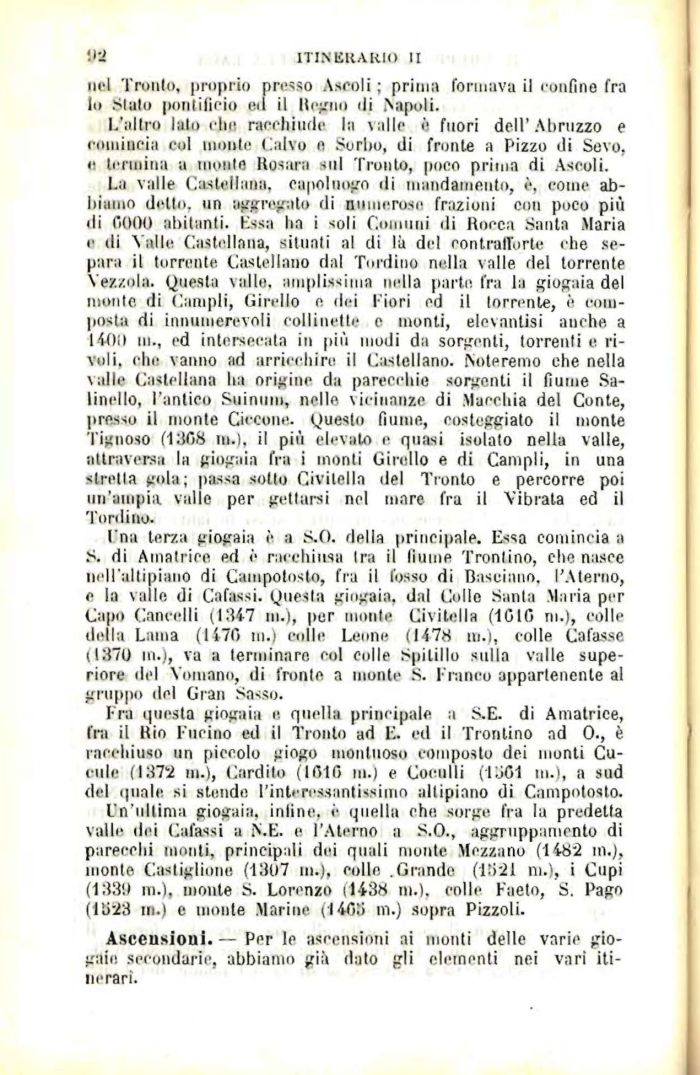 La valle Castellana, capoluogo di mandamento, è, come abbiamo dello, un aggregalo di numerose frazioni con poco più di C000 abitanti. Essa 11 n i soli Comuni ili Rocca Santa Maria e di Valle Castellana, situali al di là del contrafforte che separa il torrente Castellano dal Tordino nella valle del torrente Vezzola. Questa valle, amplissima nella parte fra la giogaia del monte di Campii, Girello e dei Fiori ed il lorrente, è composta di innumerevoli collinette e monti, elevantisi anche a litui m., ed intersecata in più modi da sorgenti, torrenti e rivoli, che vanno ad arricchire il Castellano. Noteremo che nella valle Castellana ha origine da parecchie sorgenti il fiume Sa-linello, l'antico Suinum, nelle, vicinanze di Macchia del Conte, presso il monte Ciccone. Questo fiume, costeggiato il monte Tignoso (1:108 10.), il più elevato e quasi isolalo nella valle, attraversa la giogaia fra i monti Girello e di Campii, in una stretta gola; passa sotto Civilella del Tronto e percorre poi un'ampia valle per gettarsi nel mare fra il Vibrata ed il 'l'ordino.