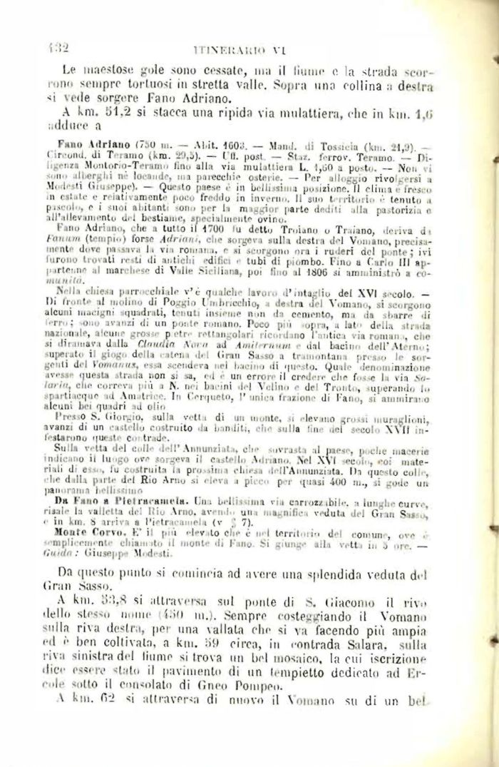 A km. 8:1,# si attraversa sul ponte di S. (iiacomo il rivo dello stesso nome Lio in.). Sempre costeggiando il Vomano sulla riva destra, per una vallata che si va facendo più ampia ed è ben colli vaia, a km. iiW circa, in contrada Salara. sulla riva sinistra del liume si trova un bel mosaico, la cui iscrizione dice essere stato il pavimento di un lempietto dedicato ad Ercole «ulto il consolato di (ìneo Pompeo.
