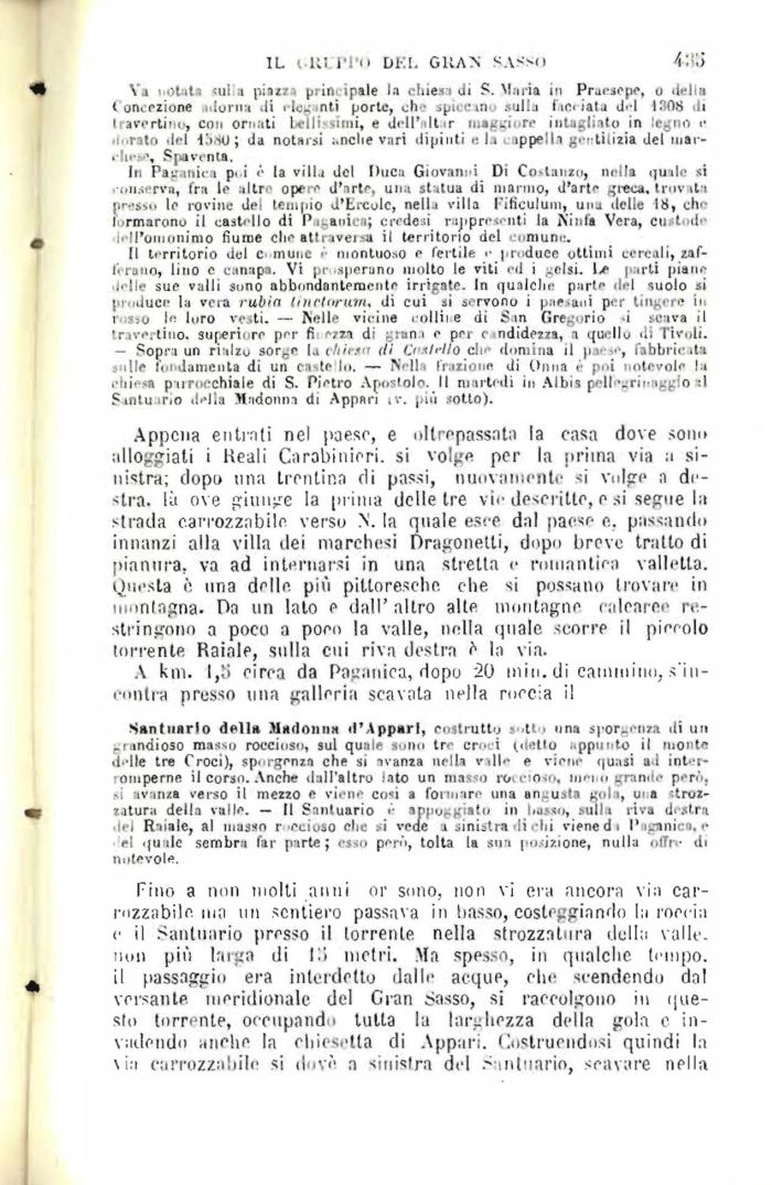 Fino a non molti anni or sono, non vi era ancora via carrozzabile ma un sentiero passava in basso, costeggiando la roccia <• il Santuario presso il torrente nella strozzatura della valle-non più larga di Ili metri. Ma spesso, in qualche tempo, il passaggio era interdetto dalle acque, che scendendo dal versante meridionale del Gran Sasso, si raccolgono in questo torrente, occupando tutta la larghezza della gola c invadendo anche la chiesetta di Appari. Costruendosi quindi la \ i:t carrozzabile si dovè a sinistra del Santuario, scavare nella