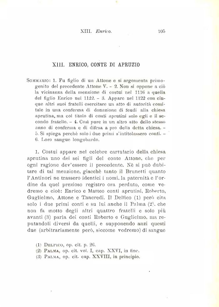 1. Costui appare nel celebre cartulario della chiesa aprutina uno dei sei tigli del conte Attone. clic, per ogni ragione dev'essere il precedente. Nè si può dubitare di tal menzione, giacché tanto il Brunetti quanto l'Antinori ne trassero identici i nomi, la paternità e l'ordine da quel prezioso registro ora perduto, come vedremo e cioè: Enrico e Matteo conti aprutini, Roberto, Guglielmo, Attone e Tancredi. Il Delfico (1) però cita solo i due primi conti e su lui anche il Palma (2\ che non fa motto degli altri quattro fratelli e solo più avanti (3) parla dei conti Roberto e Guglielmo, ma reputandoli diversi da quelli, e supponendo anzi questi due (arbitrariamente però, siccome vedremo) di sangue