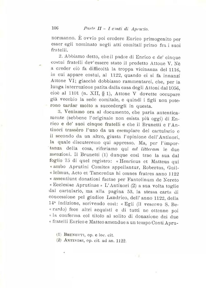 3. Veniamo ora al documento, che parla autenticamente (sebbene l'originale non esista più oggi) di Enrico e de' suoi cinque fratelli e che il Brunetti e l'An-tinori trassero l'uno da un esemplare de) cartulario c il secondo da un altro, giusta l'opinione dell'Antinori, la quale discuteremo qui appresso. Ma, per l'importanza della cosa, riferiamo qui ad. Litteram le due menzioni. Il Brunetti (1) dunque così trac la sua dal foglio 75 di quel registro: « Henricus et Matteus qui «ambo Aprutini Comites appellantur, Robertus, G-uil-« lclinus, Acto et Tancredus hi oinnes fratres anno 1122 « assentiunt donationi factae per Fantolinum de Nereto « Ecclesiae Aprutinae » L'Antinori (2) a sua volta toglie dal cartulario, ma alla pagina 53, la stessa carta di concessione pel giudice Landrico, dell'anno 1122, della li1 indizione, scrivendo cosi: « Egli (il vescovo S. Be-« rardo) fece altri acquisti e di tutti ne ottenne poi « la conferma col titolo al solito di donazione dei due « fratelli Enrico e Matteoaniendueaun tempo Conti Apru-