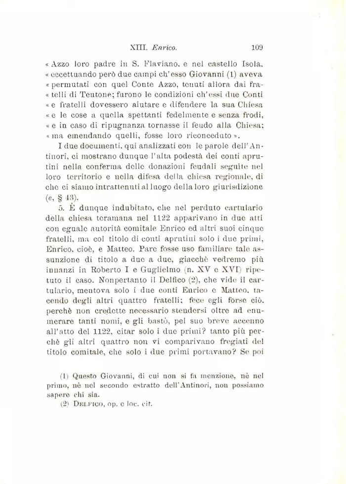 ó. È dunque indubitato, che nel perduto cartulario della chiesa teramana nel 1122 apparivano in due atti con eguale autorità comitale Enrico ed altri suoi cinque fratelli, ma col titolo di conti aprnliiii solo i due primi, Enrico, cioè, e Matteo. Pare fosse uso familiare tale assunzione di titolo a due a due, giacché vedremo più innanzi in Roberto I e Guglielmo ;n. XV e XVI' ripetuto il caso. Nonpertanto il Delfico (2), che vide il cartulario, meutova solo i due conti Enrico e Matteo, tacendo degli altri quattro fratelli; fece egli forse ciò. perchè non credette necessario stendersi oltre ad enumerare tanti nomi, e gii bastò, pel suo breve accenno all'atto del 1122, citar solo i due primi? tanto più perchè gli altri quattro non vi comparivano fregiati del titolo comitale, che solo i due primi portavano? Se poi