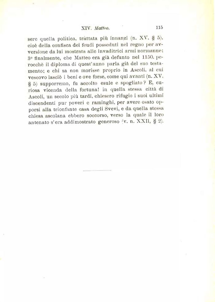 sere quella politica, trattata più innanzi (n. XN*. $ 5). cioè della confisca dei feudi posseduti nel regno per avversione da lui mostrata alle invaditriei armi normanne: 3° finalmente, che Matteo era già defunto nel 1150. perocché il diploma di quest'anno parla già del suo testamento; e chi sa non morisse proprio in Ascoli, al cui vescovo lasciò i beni e ove forse, come qui avanti (n. XV. § 5) supporremo, fu accolto esule e spogliato V E, curiosa vicenda della fortuna! in quella stessa città di Ascoli, un secolo più tardi, chiesero rifugio i suoi ultimi discendenti pur poveri c raminghi, per avere osato opporsi alla trionfante casa degli Svevi, e da quella stessa chiesa ascolana ebbero soccorso, verso la quale il loro antenato s'era addimostrato generoso 'v. n. XXII, § •>).