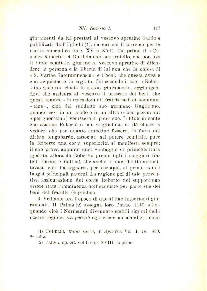 giuramenti ila lui prestati al vescovo aprutino Guido e pubblicati dall'Ughelli (1), da cui noi li torre ni o per la nostra appendice (doc. XV e XVI). Col primo il « Co-« mes Robertus et Guillelnius » suo fratello, che non usa il titolo comitale, giurano al vescovo aprutino di difendere la persona e la liberta di lui non che la chiesa di « S. Mariae Interamnensis » e i beni, che questa avea e che acquistasse in seguito. Col secondo il solo « Rober-« tus Comes» ripete lo stesso giuramento, aggiungendovi che assicura al vescovo il possesso dei beni, che questi teneva «in terra dominii fratris mei. et hominum «eius», cioè del suddetto suo germano Guglielmo, quando essi in un modo o in un altro («per paecm aut « pei- gucrraiu ») venissero in poter suo. Il titolo di conte che assume Roberto e non Guglielmo, ci dà chiaro a vedere, che per quanto ambedue fossero, in forza del diritto longobardo, associati nel potere comitale, pure in Roberto una certa superiorità si manifesta sempre: il che prova appunto quel vantaggio di primogenitura goduta allora da Roberto, premortigli i maggiori fratelli Enrico e Matteo), che anche in quel diritto ammet-tevasi, con l'assegnarsi, per esempio, al primo nato i luoghi principali paterni. La ragione poi di tale preventiva assicurazione del eonte Roberto noi supponiamo essere stata l'imminenza dell'acquisto per parte sua dei beni del fratello Guglielmo.